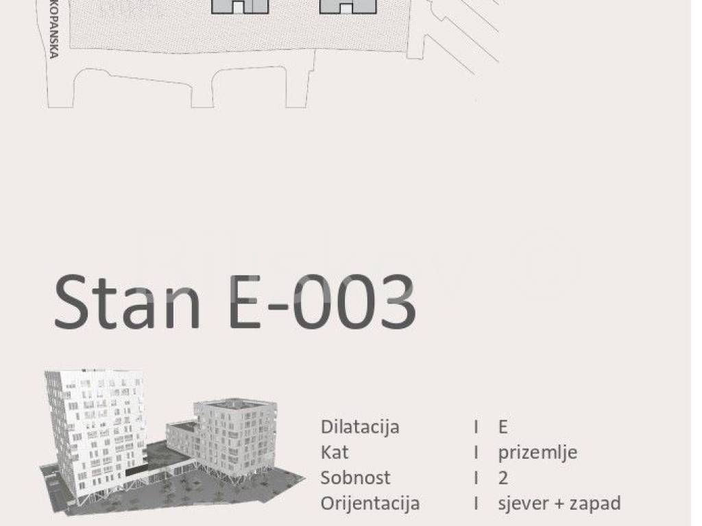 Apartment E 003, with an area of 82.57 m2, is located on the ground floor and consists of 2 bedrooms, a kitchen with a dining room and a living room, a bathroom, a toilet and a loggia.