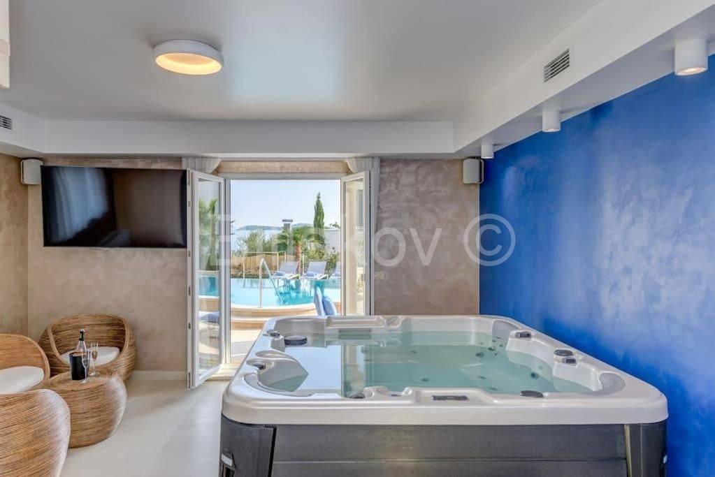 Prostrana bazenska terasa nudi infinity bazen od 50 m2 s grijanjem, whirlpoolom i protustrujnim plivanjem.