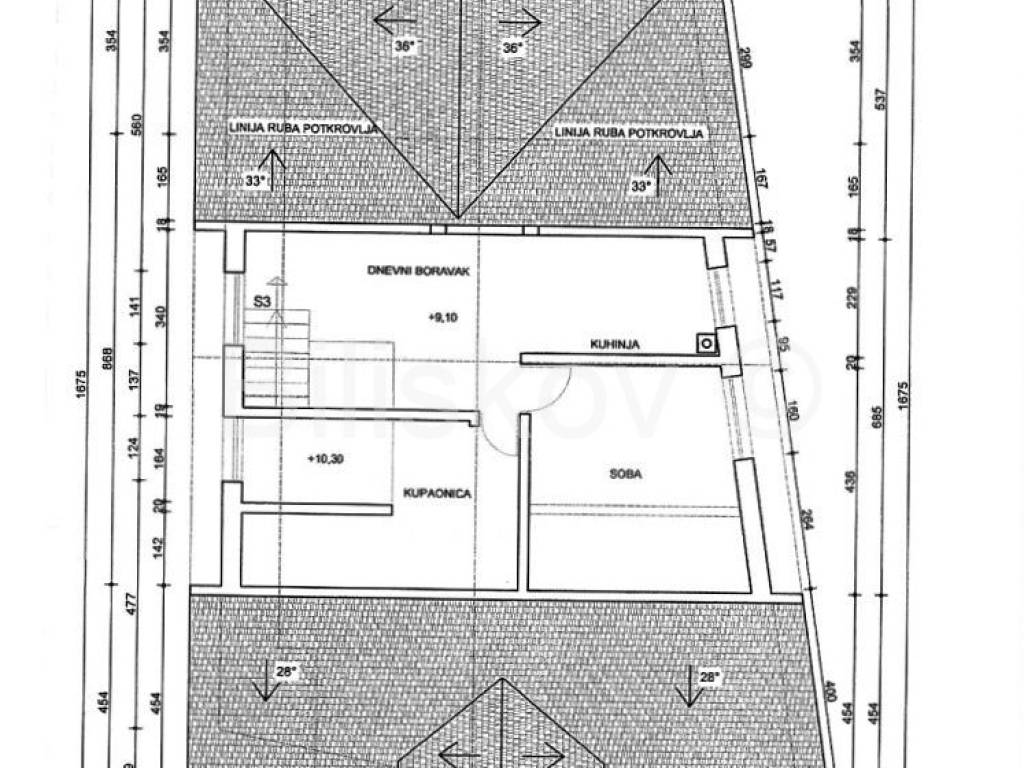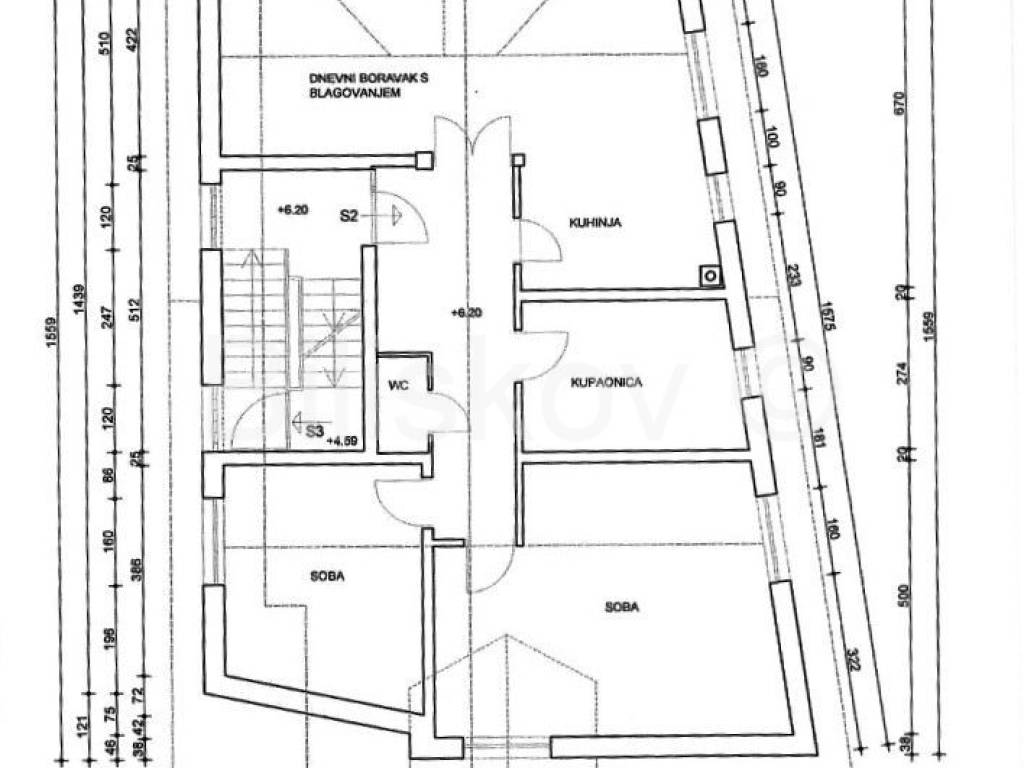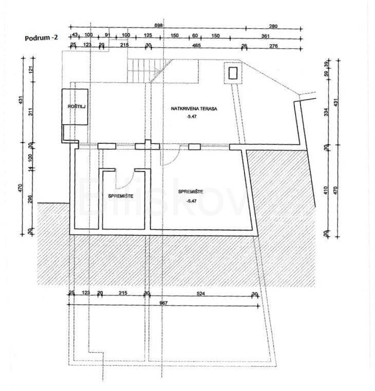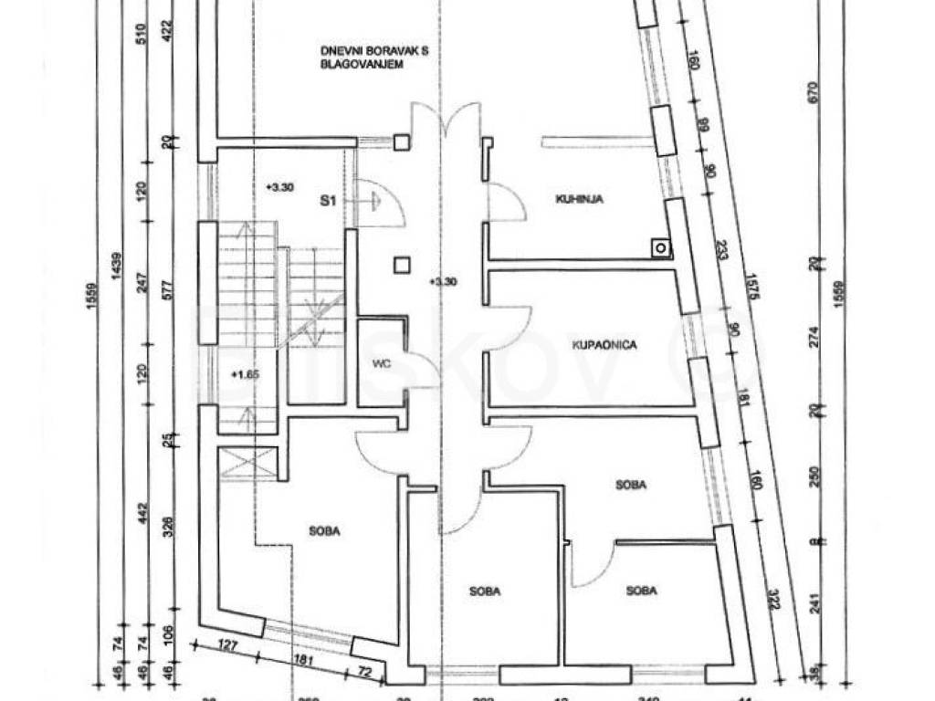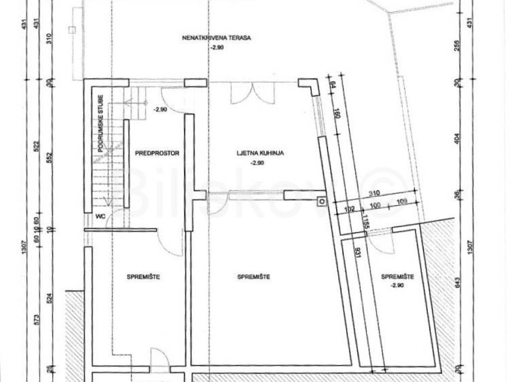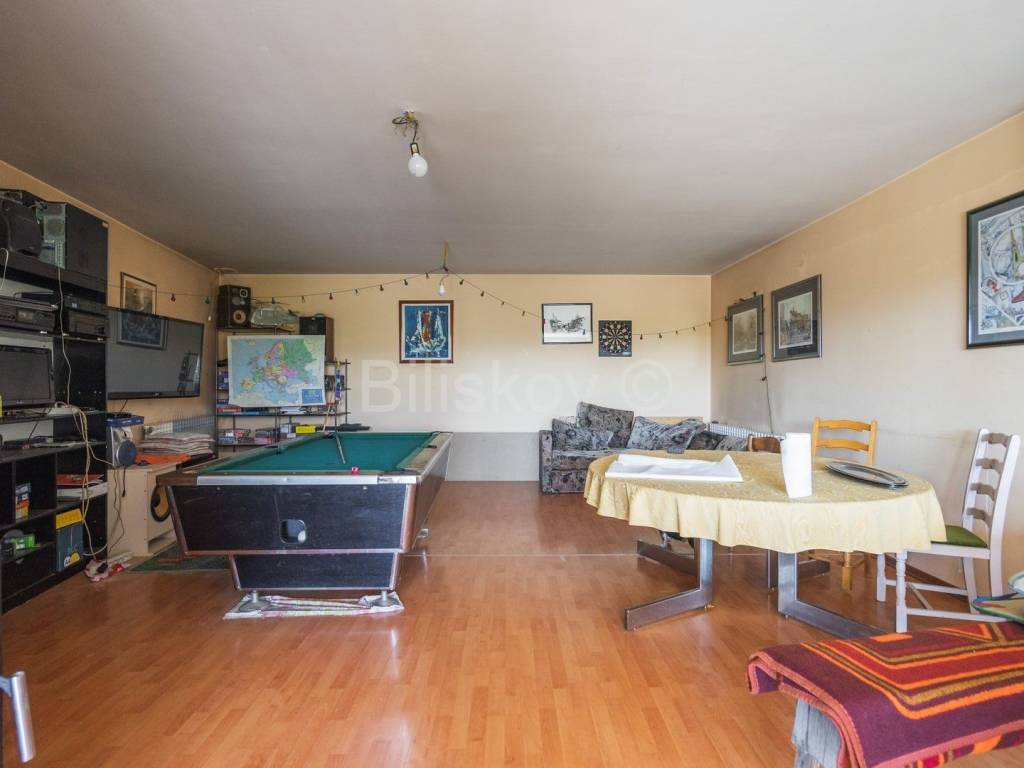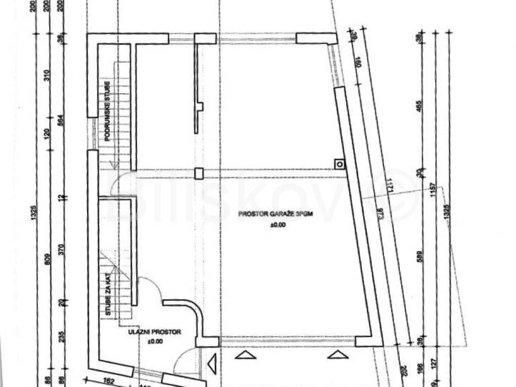 Basement on the floor -2 (50 m2) contains a storage room with a covered terrace.Basement on the floor -1 (110 m2) has a spacious room for recreation, storage and summer kitchen withexit to the terrace. The ground floor (90 m2) consists of a storage room and two garages.On the first floor (110 m2) there is a fully furnished five-room apartment, while the second floor (110 m2) and the attic (35 m2) are in unfinished condition and if desired, two additional and even three residential units can be arranged.