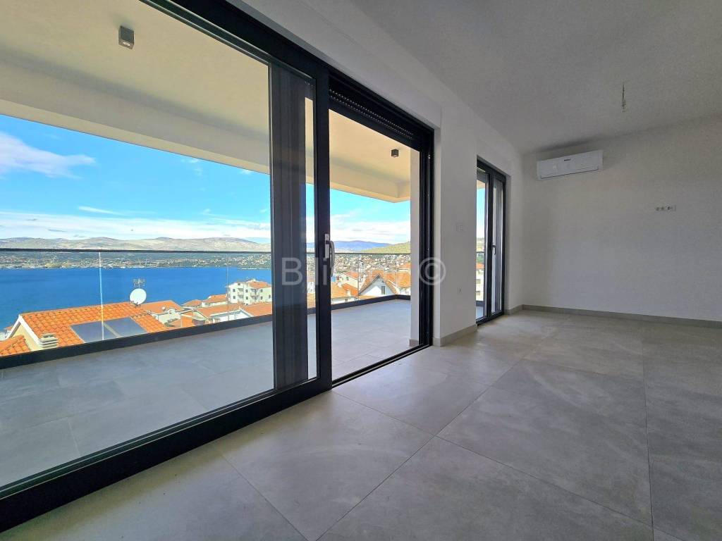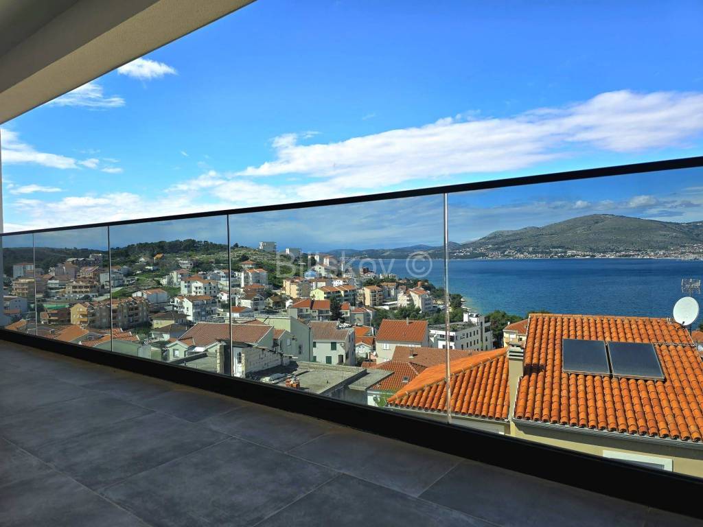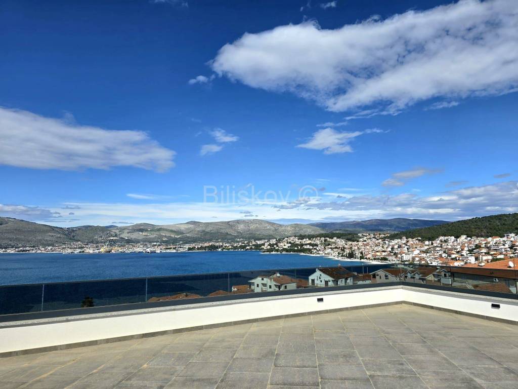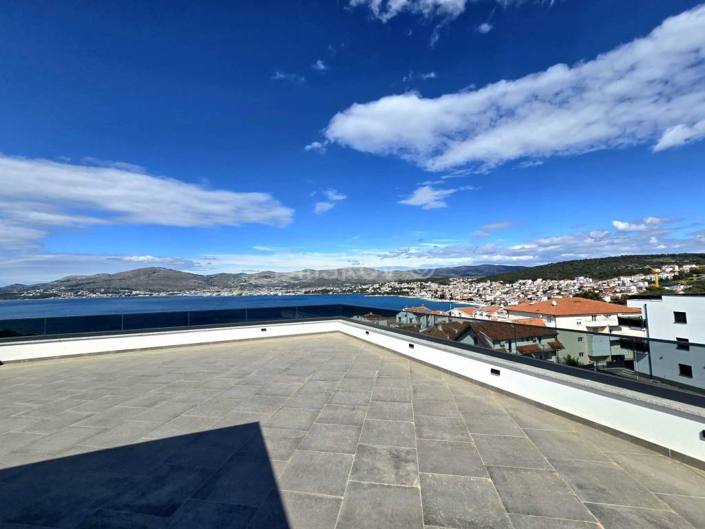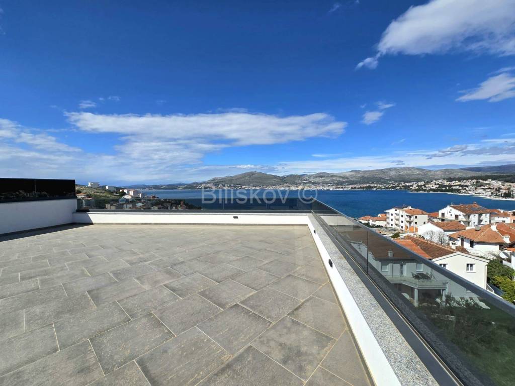 Trogir, Čiovo, stan površine neto površine 74,30 m2, s natkrivenom terasom 16,38 m2na trećem katu, s krovnom terasom 98,58 m2 na četvrtom katu, u novogradnji s liftom.