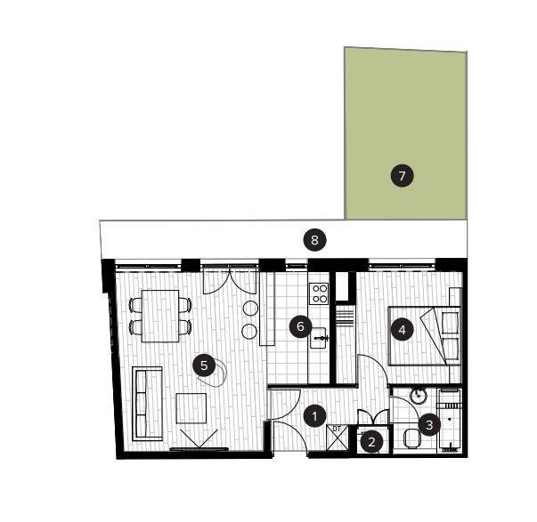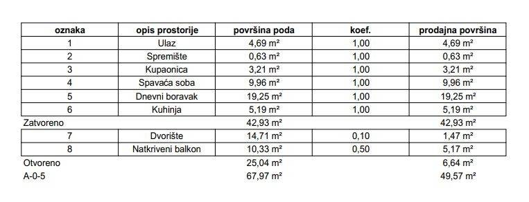 Stan će se nalaziti u prizemlju zgrade, ukupne prodajne površine 49,57 m (ukupna neto površina poda iznosi 67,97 m), a sastoji se od ulaznog prostora, open space dnevnog boravka s blagovaonicom i kuhinjom, spavaće sobe, kupaonice, natkrivene terase, dvorišta i spremišta.
