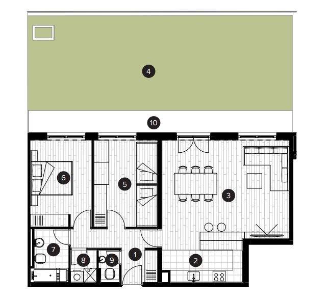 Stan će se nalaziti u prizemlju zgrade, ukupne prodajne površine 85,49 m (ukupna neto površina poda iznosi 141,48 m), a sastoji se od ulaznog prostora, dnevnog boravka s blagovaonicom, kuhinje, dvije spavaće sobe, kupaonice, zasebnog WC-a, natkrivene terase, dvorišta i spremišta.