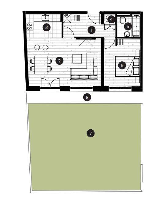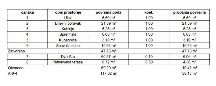 Stan će se nalaziti u prizemlju zgrade, ukupne prodajne površine 58,15 m (ukupna neto površina poda iznosi 117,02 m), a sastoji se od ulaznog prostora, open space dnevnog boravka s blagovaonicom i kuhinjom, spavaće sobe, kupaonice, natkrivene terase, dvorišta i spremišta.