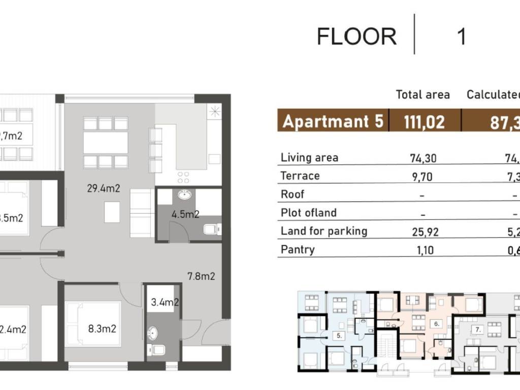 Stan 5 smješten je na prvom katu, a njegova ukupna površina iznosi 111,02 m, s obračunskom površinom od 87,31 m, ovaj stan ima tri prostrane spavaće sobe, što ga čini idealnim izborom za obitelji ili one koji traže dodatni prostor i udobnost.