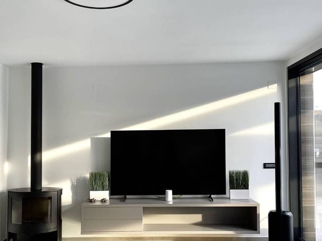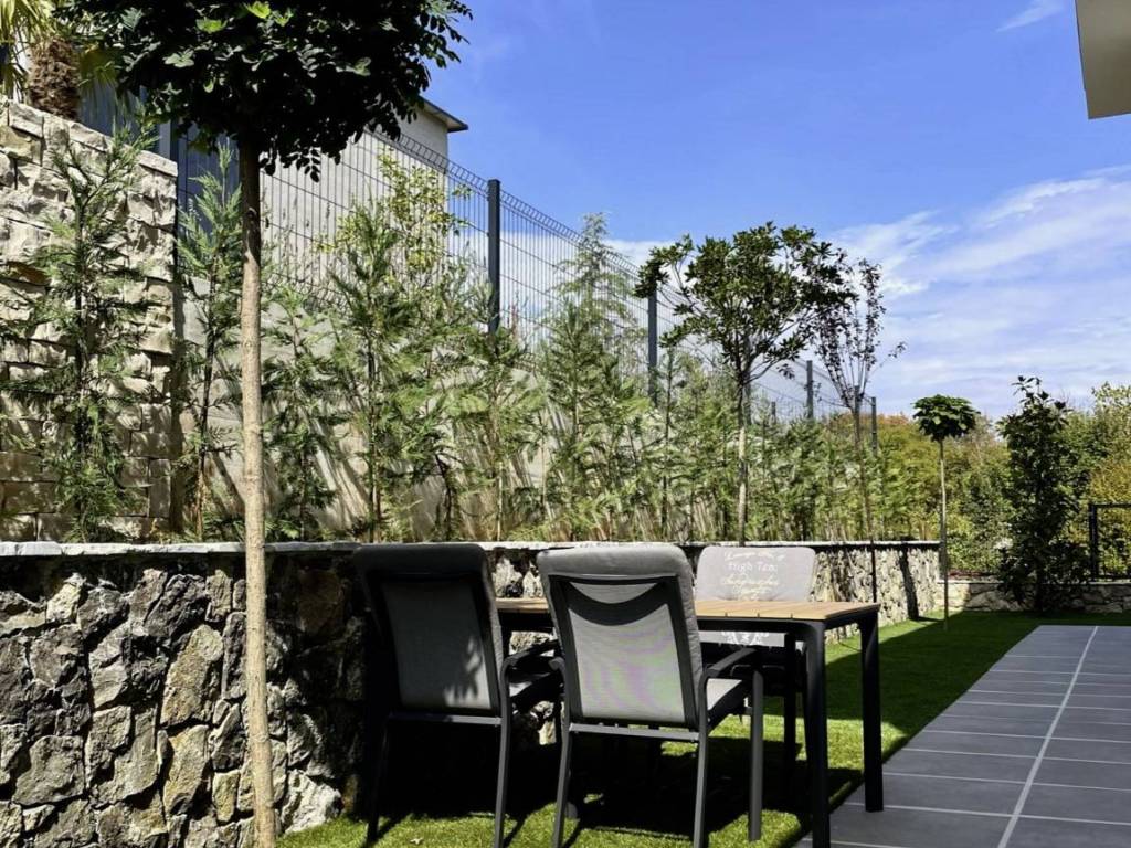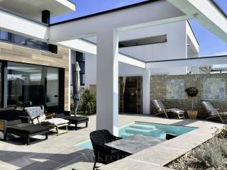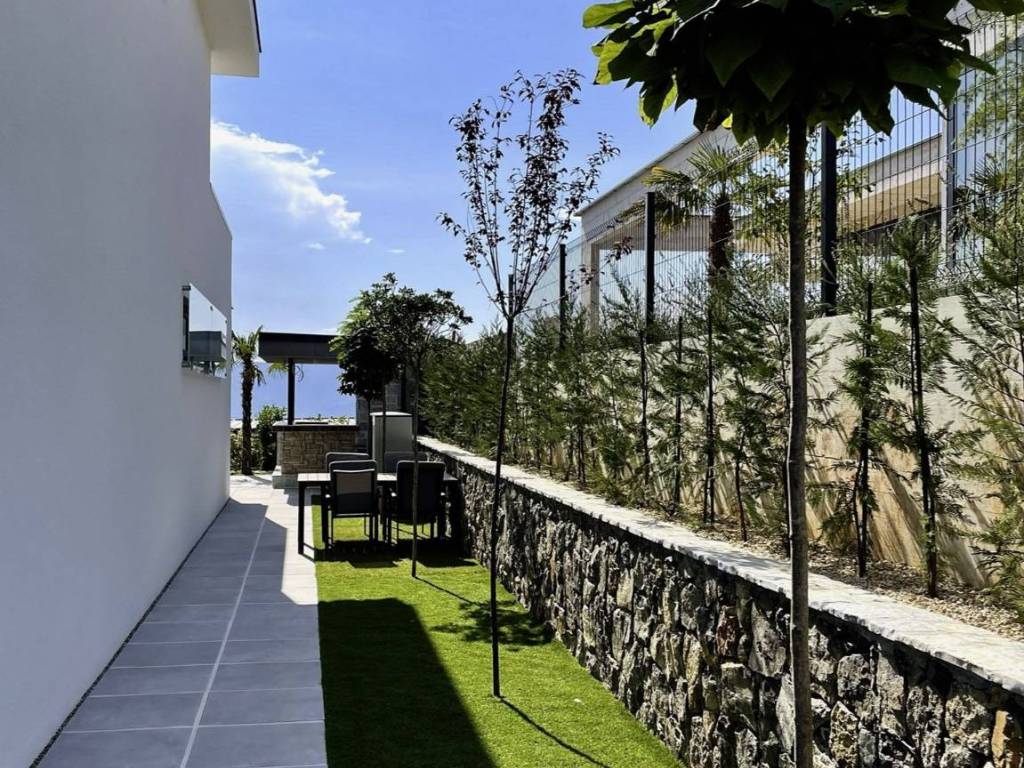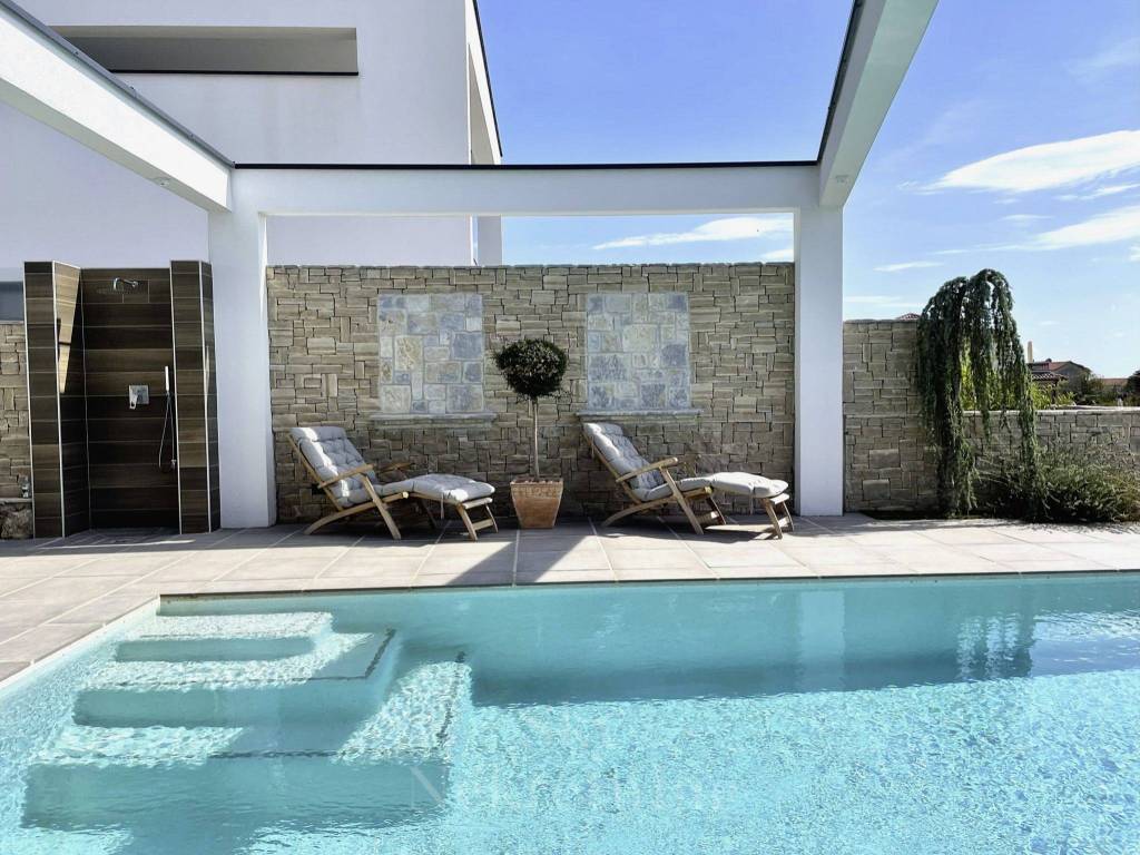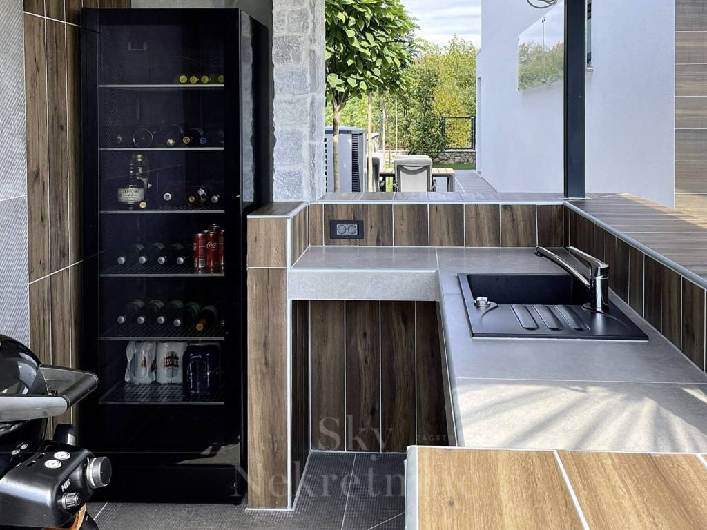 The villas exterior is designed for complete enjoyment, featuring an infinity pool with a sunbathing area, a summer kitchen with a grill, an outdoor dining table, and additional spaces for coffee or brunch. The property also includes parking for three cars, a technical equipment room, and a pool pump area.