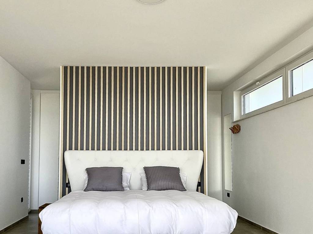 The ground floor includes a modern kitchen with an island, a bright dining area, and a living room with views of the sea and pool. Additionally, this level houses two bedrooms, each with an en-suite bathroom and terrace, as well as a guest toilet.