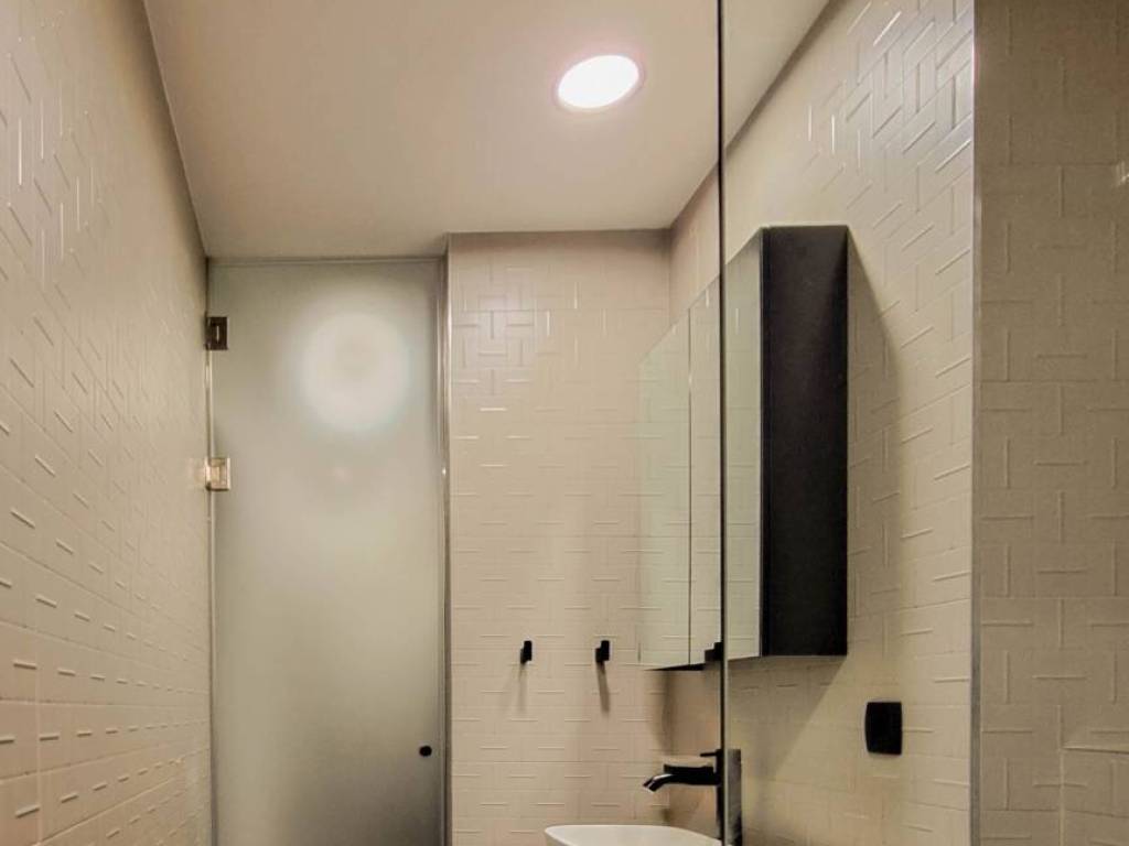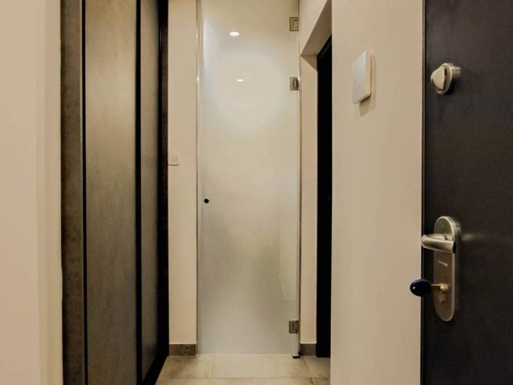 Manja spavaća soba pregrađena je kaljenim staklom, koje je pomično i odvaja je od dnevnog boravka.