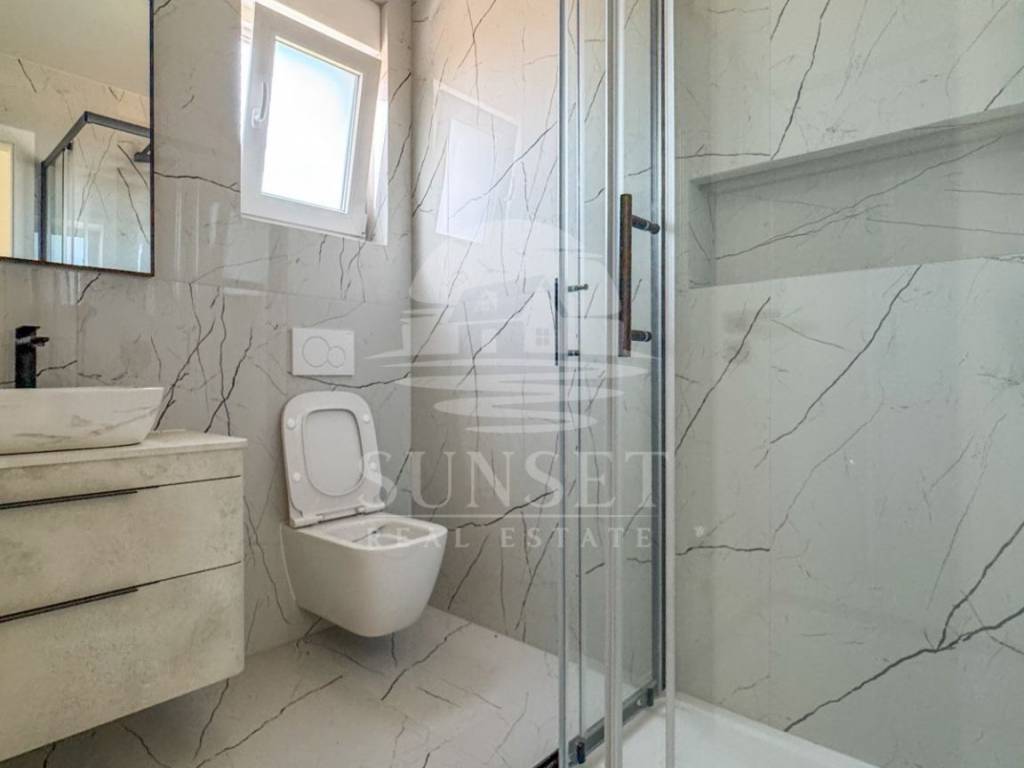 A charming house with a swimming pool for sale in the surroundings of Momjan. The house has a total area of 173 m2 and extends over two floors. The ground floor features a spacious living room connected to the kitchen and dining area with access to a covered terrace, a bathroom, storage, and utility room. The upper floor consists of three bedrooms, two bathrooms, a technical room, and a large covered terrace of 26 m2. The landscaped garden of approximately 340 m2 includes a 25 m2 swimming pool with a sunbathing area, an auxiliary building of the same size, and two parking spaces.The house is being built with high-quality materials and is equipped for underfloor heating via a heat pump and air conditioning cooling. It features triple-glazed windows with electric shutters, and ceramic tiles will be installed throughout the interior. The exterior will be fully landscaped, and the facade will be energy-efficient (10 cm insulation), ensuring minimal heating and cooling costs.Completion of construction is planned for summer 2024.The property is located just a few kilometers from Momjan and a short drive from Buje and all amenities. The sea and beaches are about 15 km away.