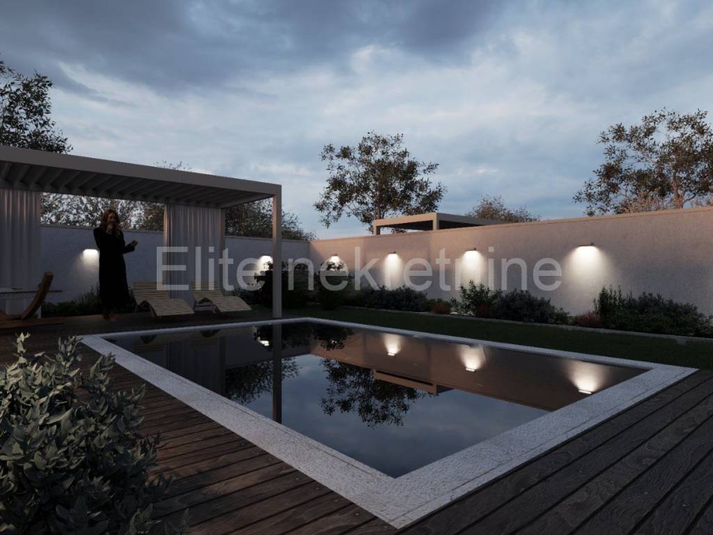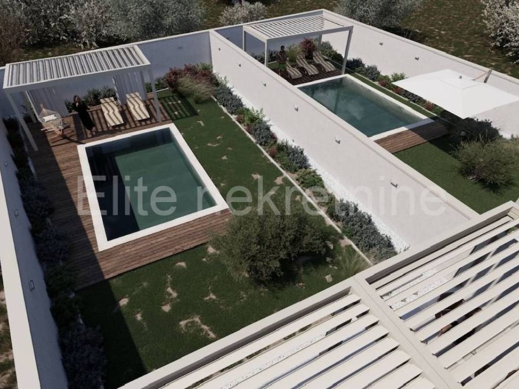 Apartment S1 includes the ground floor and the first floor:- on the ground floor there is an open kitchen, dining room and living room, two bathrooms, a bedroom and a terrace of 24.81 m2, from which you can access a private swimming pool of 15 m2 in a fenced garden/yard of 149 m2- on the first floor there are two more bedrooms, a dressing room, a living room, a bathroom and a covered terrace of 17.45 m2,of living space is 140.75 m2, and the total calculated net usable area is 183.02 m2.The apartment has 2 parking spaces.