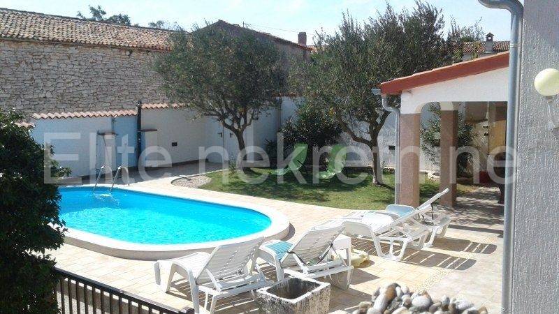 In a quiet location in the Peruški settlement, an adapted one-story house intended as a house is for saleand for vacation or homeand for a peaceful life. It is surrounded by a spacious rich eyeno total sizeof 539 m2 where there is a large selection of plants such as magnolia, mulberry, olive, a green wall next to the pool made of jasmine and wisteria and a pergola covered with wisteria that provides shade on hot days. We highlight privacy as a big plusand on which it was conceivednothing. It is fenced with a high fence and a spacious portuno, making it a safe place for your children and familynot pets. Entrance to the houseand opens with a corridor that connects all the rooms. Adapted in 2022, kuand consists of two bedroomse bedroom, living room, kitchen and bathroom, total area 94 m2. It is equipped with: - Floor heating in the living room- Completely new plumbing and electricitynot installations in the whole houseand- Modern ceramicske ploin the living room, hallway, kitchen and bathroom- Laminate in the bedroomtheir rooms- New modern kitchen with washing machine, microwave ovennic, refrigerator and floorom for cooking- Modern furniture in the living room, dining room and bedroomoh room- Modern bathroom with walk-in shower- Outdoor grill and garden furniture- Swimming pool surrounded by landscaped greenery and a beautiful garden with an old Frrotted wood- Pergola covered with wisteria- Outside covered terrace that is legalized and can be closed/turned into an additional room- Outdoor toilet next to the pool- External boiler room for the pool- A separate garage, he saysine approx. 15m2 that can be upgraded with an additional floor/moreom terrace with a panoramic view of the entire bay Real estate is an opportunity to live where the pace slows down a little and life flourishes more. For viewing and other information, contact the agent directly:
