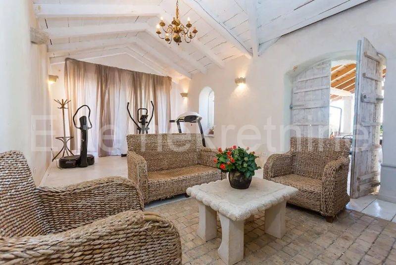 Tu su i 2 bazena, jedan grijani bazen od 50 m2, i jedan dječji bazen od 18 m2, kao i konoba sa kaminom pokraj prostrane ljetne kuihnje sa parkom za djecu. Dječja soba ima stakleni krov, a u blagovaonici se nalazi prostrani hrastov stol.
