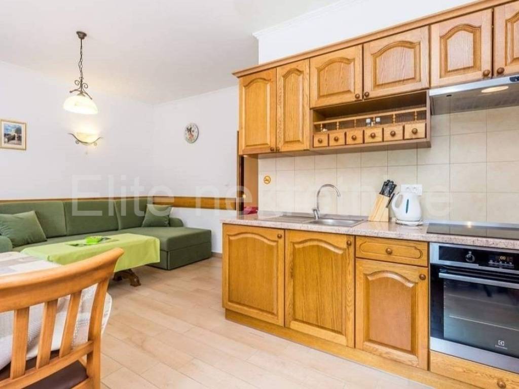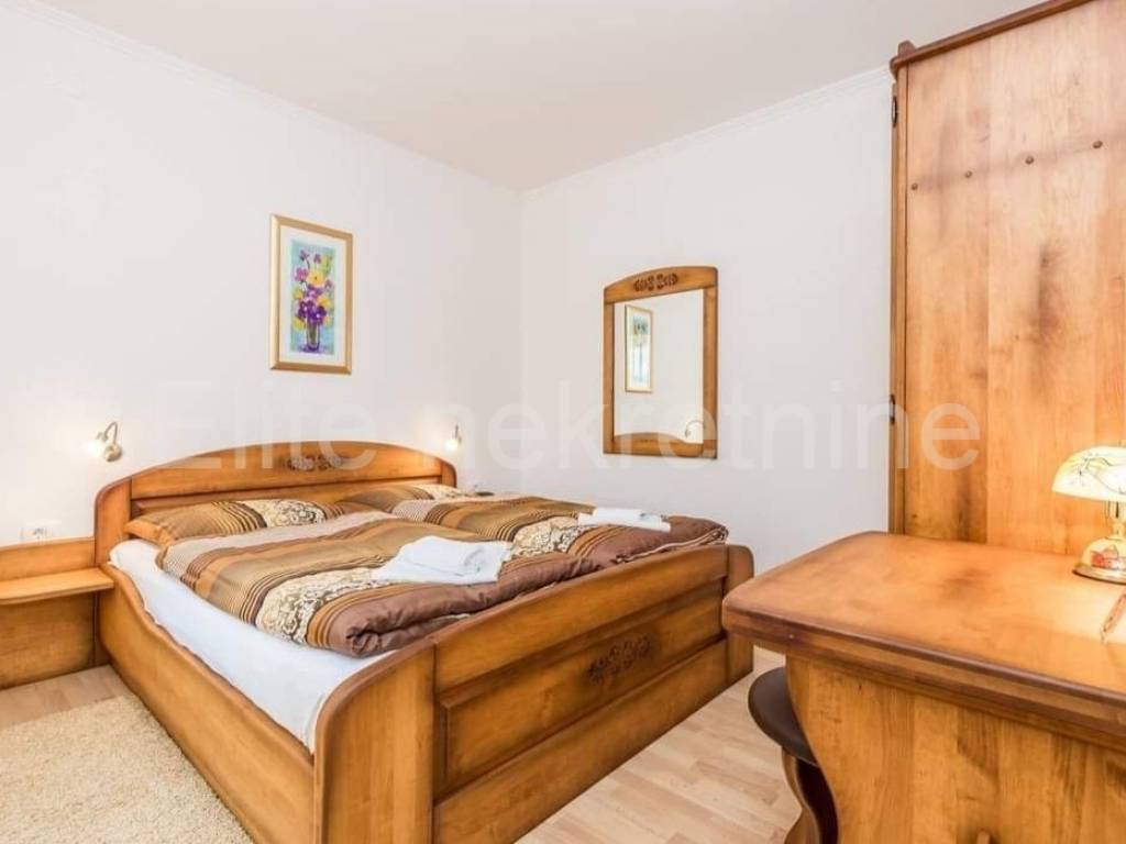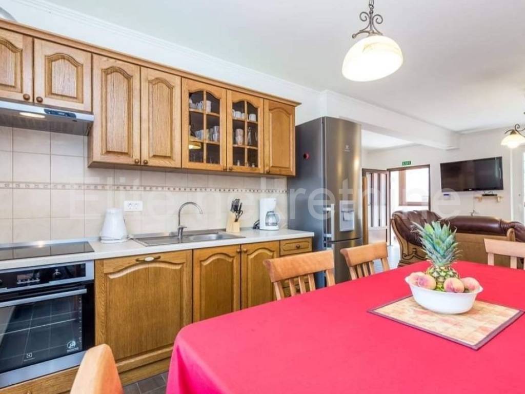 An additional 200 m2 of land is donated with the purchase of a house. It is for sale furnished, and the furniture is made of solid wood.