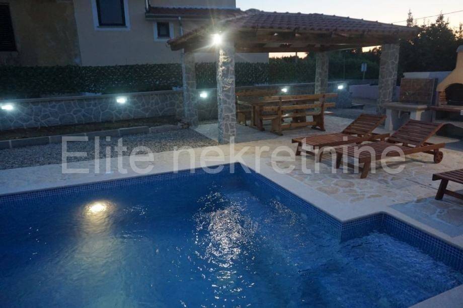 U sklopu kuće je sređena okućnica 911 m2 sa nadstrešniom, bazenom i kaminom (roštiljem).