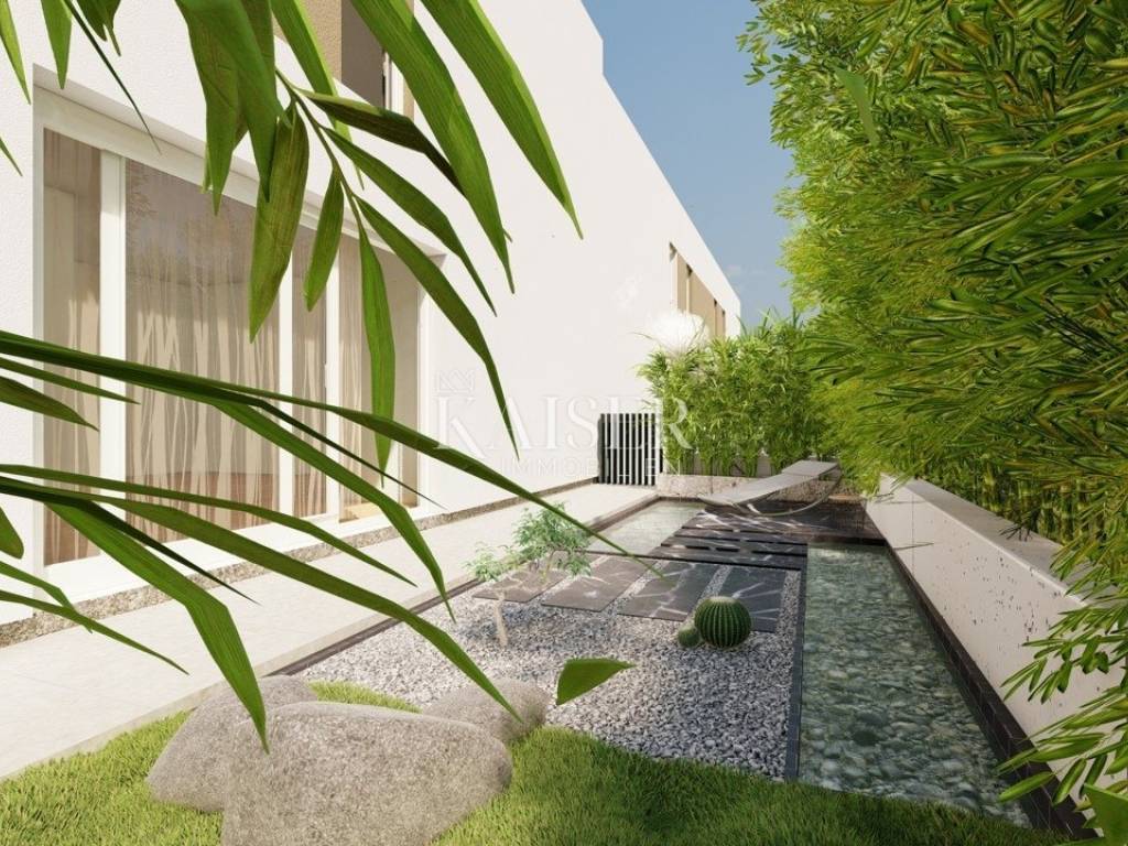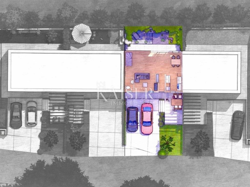 Kaiser Immobilien offers a modern terraced house, located in a quiet village on the outskirts of Poreč. The property is in a prime location, just 2.5 km from the nearest beaches and close to all necessary amenities. The sea is only a few minutes' drive away, while the village center is a short walk away. The house, with a total living area of 101 m², is spread over two floors. On the ground floor there is a large, bright living area that combines the living room, dining room and kitchen. Large glass walls provide access to the terraces on the east and west sides of the house, which provide the space with plenty of natural light throughout the day. On the ground floor there is also a guest toilet and a practical storage room. An internal staircase leads to the first floor where there are three bedrooms, a shared bathroom and a master bedroom with its own loggia, which offers a partial view of the sea and the surrounding nature. The 105 m² plot is fully fenced and provides a high level of privacy. A covered paved area is planned, ideal for an outdoor dining area, as well as a concrete parking space for at least two vehicles. Heating and cooling are provided by air conditioning in all rooms, and additional equipment can be installed upon agreement with the investor. The house is being sold unfurnished, with already installed sanitary facilities in the bathrooms, and is being delivered on a turnkey basis. Works began at the end of 2024, and construction is planned to be completed by the end of 2025. This elegant and functional new building offers an ideal combination of peaceful surroundings, modern architecture and proximity to the sea, making it the perfect choice for a permanent home, vacation or investment in tourist rentals. The agency's commission for the buyer is 3% + VAT. The commission covers all services related to the purchase and is paid only in the case of purchasing a property, upon conclusion of the first legal act. For all additional information, please contact: Dean Cvitko Phone: +385915284449 E-mail: dean.cvitko@kaiser-immobilien.hr