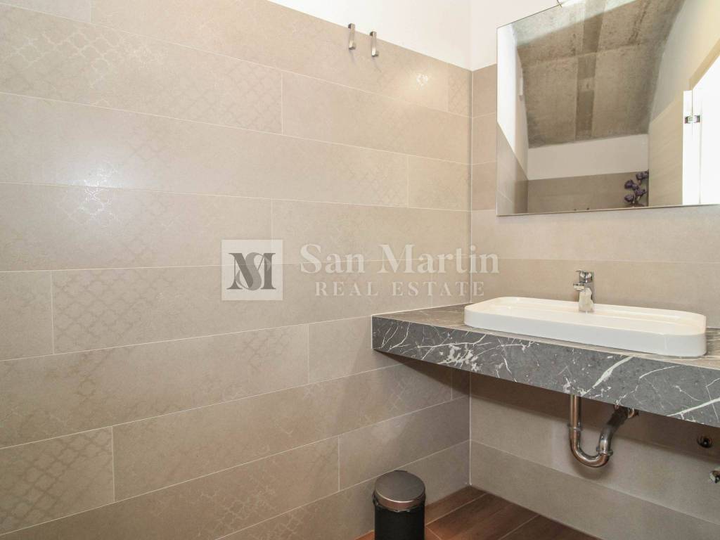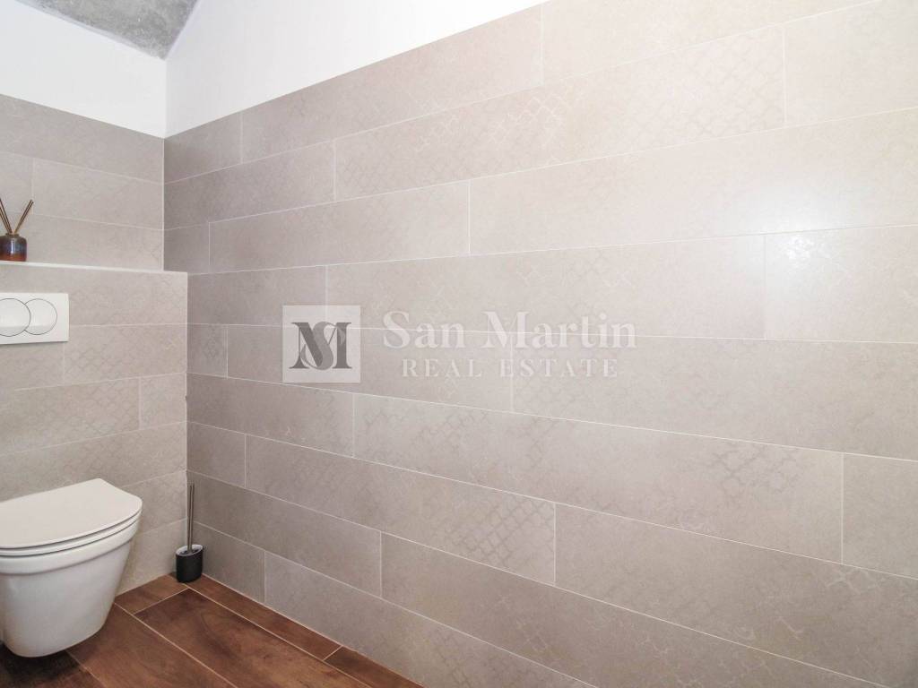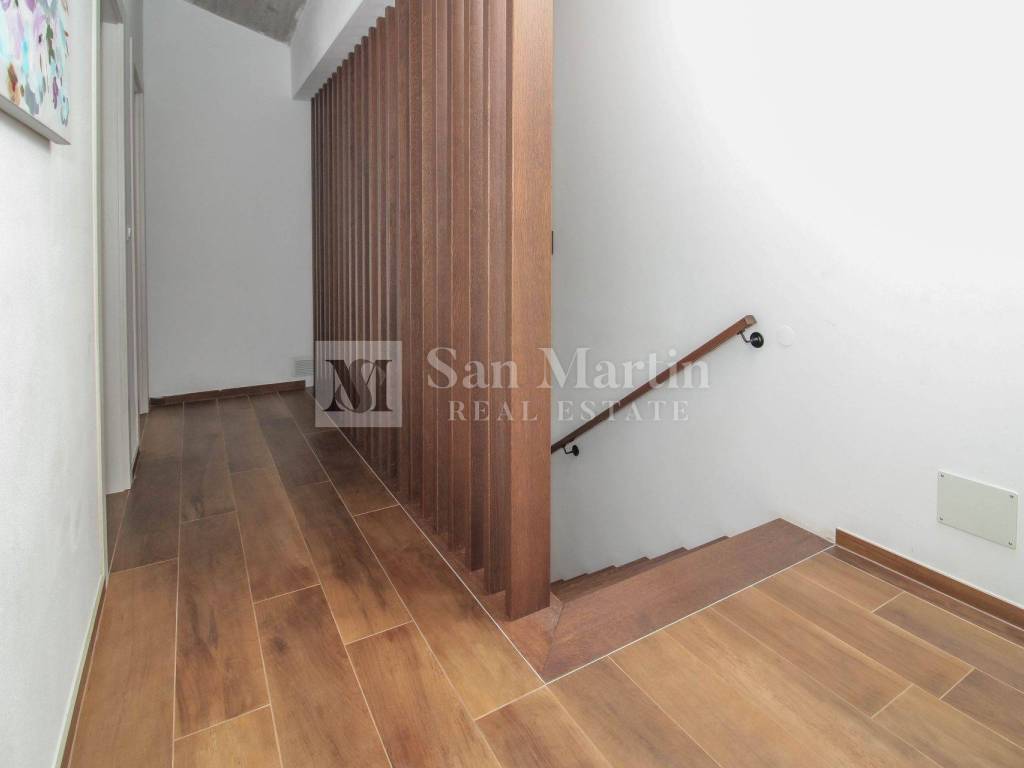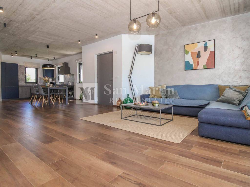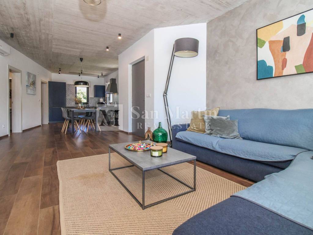The house is built in a contemporary architectural style, with an emphasis on clean lines and industrial interior design. Heating and cooling are provided via air conditioning units, while a wood-burning fireplace with warm air distribution throughout the property adds extra comfort in the winter months. All openings are equipped with electric shutters.