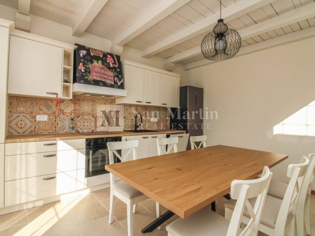 In the garden, there is a swimming pool with a summer kitchen and a sunbathing area, surrounded by olive trees and Mediterranean plants. A parking area for three cars is located in front of the house.