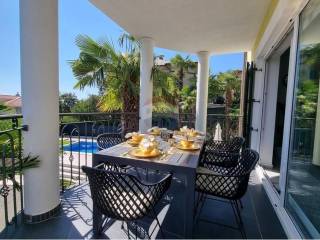 For lovers of outdoor activities, the apartment offers an outdoor gazebo and swimming pool. Additional amenities include private parking and warm air conditioning for maximum comfort all year round.