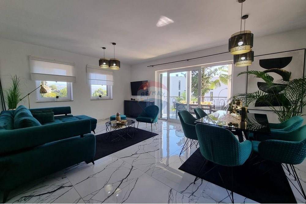 The apartment is located on the ground floor of a three-story building, and offers a spacious and functional interior with three rooms, including two bedrooms and two modern bathrooms. The living room with kitchen and dining area is furnished with care and style, providing the perfect balance between contemporary and Mediterranean design.