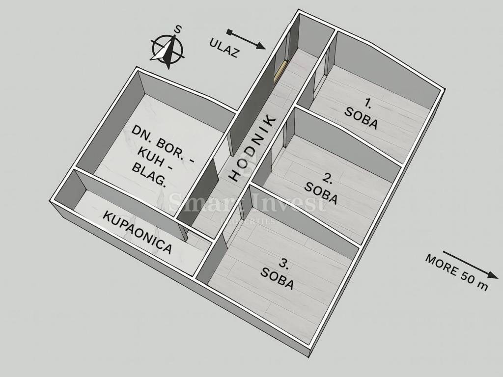 The apartment of 70 m consists of an entrance hall leading to 3 elegant bedrooms facing the sea, a kitchen with living room, and a bathroom.