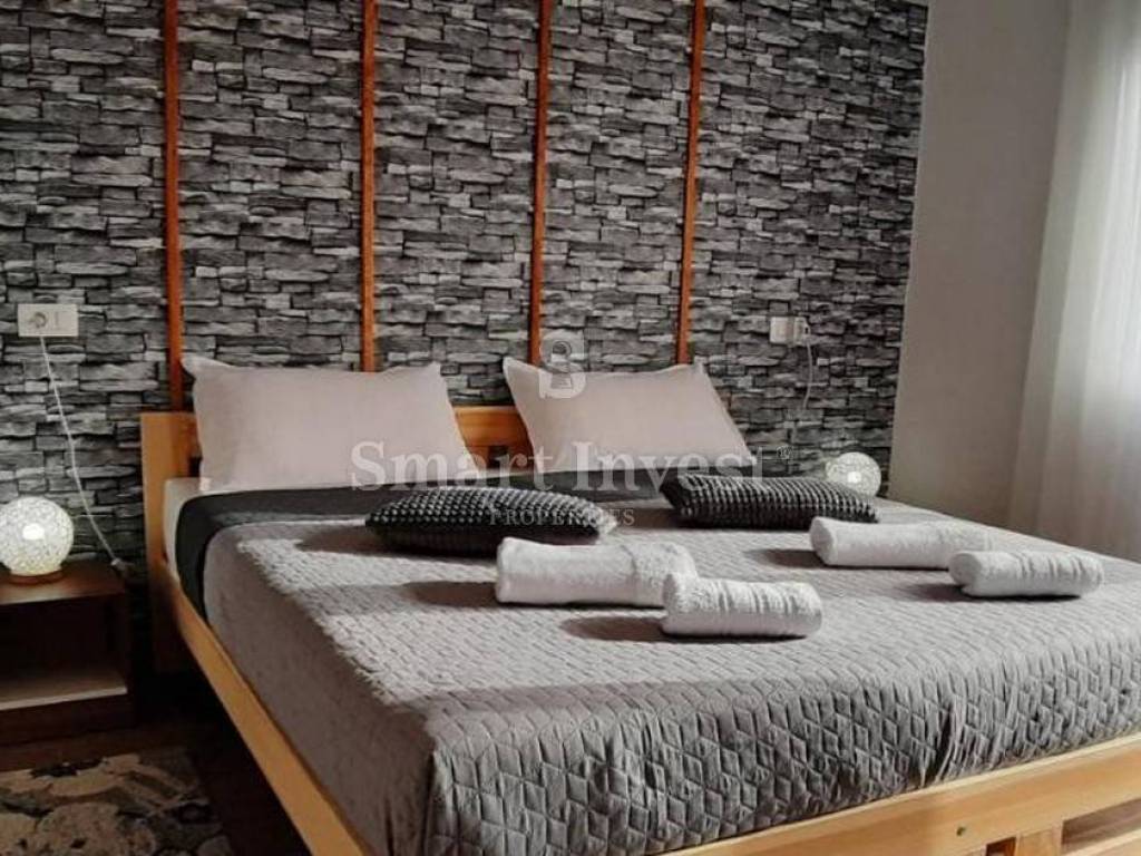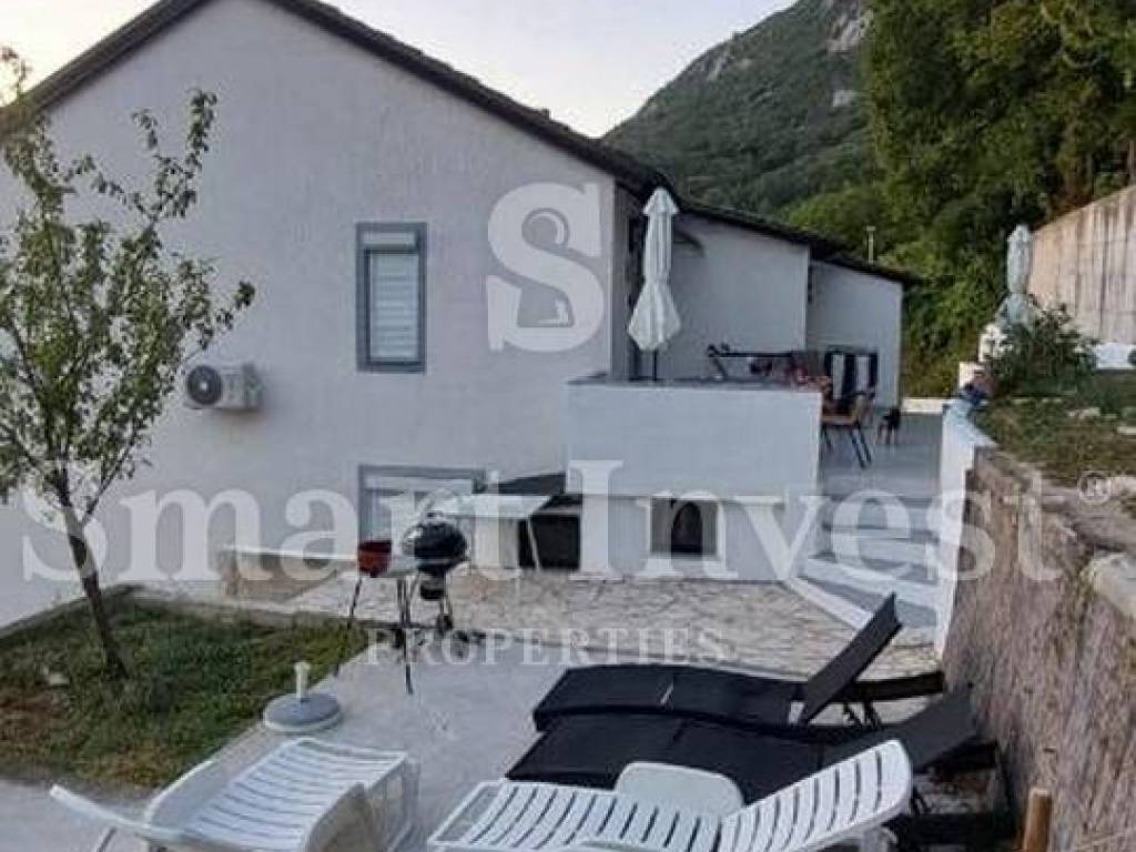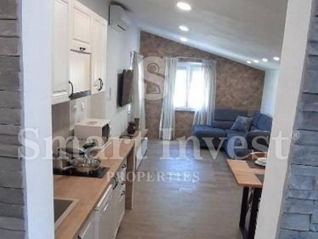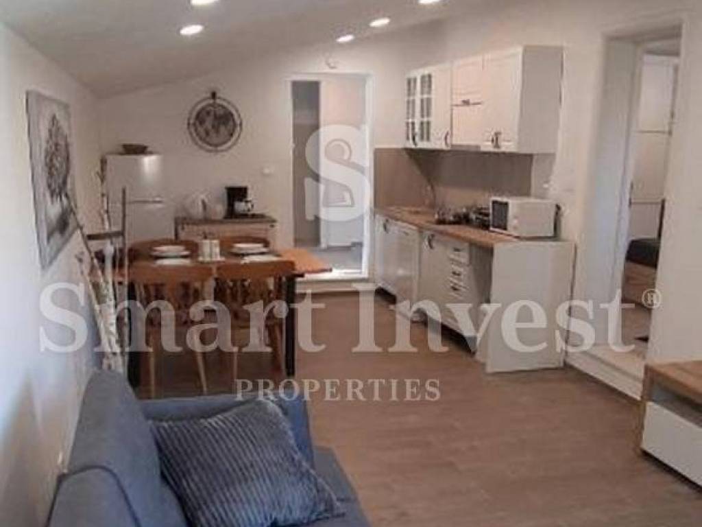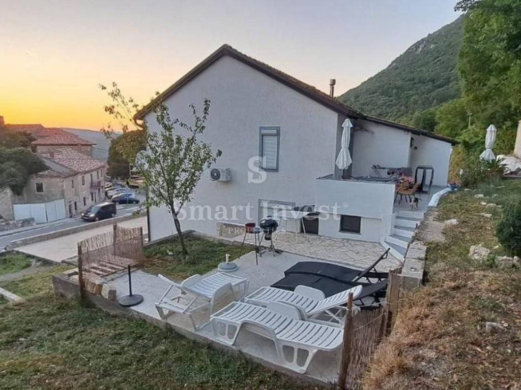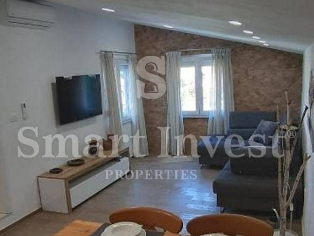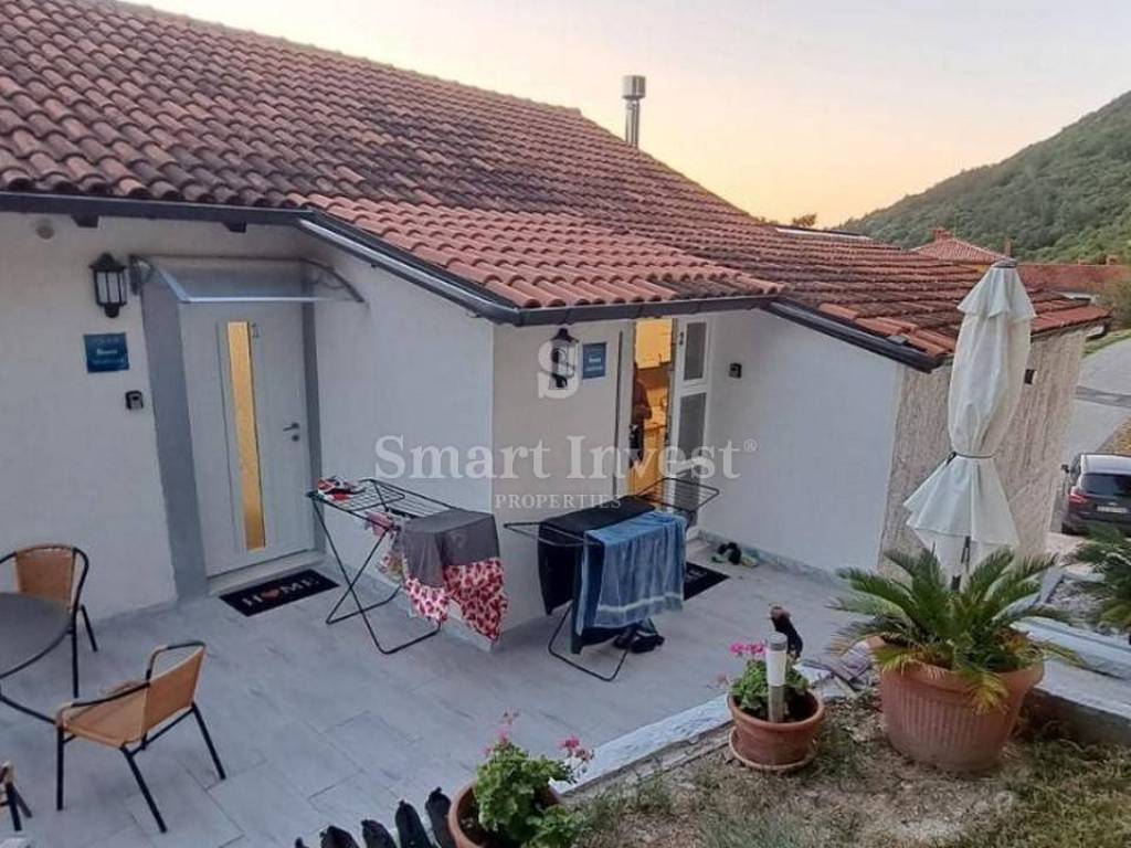 On the lower floor of 105 m2 there is a three-room apartment with a large terrace and a garage from which you can enter directly into the apartment. There is also a pergola and a barbecue. The apartment is being renovated, it is currently in the final stage. Everything is air-conditioned, and for the winter there is an additional chimney and solid fuel stove. On the side is a small laundry room with a separate entrance.