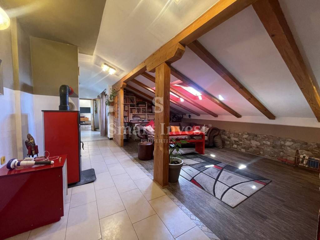 The second apartment is in the high attic of 119.72 m2, which consists of a hallway, dining room, bathroom, kitchen, two bedrooms, living room and a terrace of 10.61 m2.