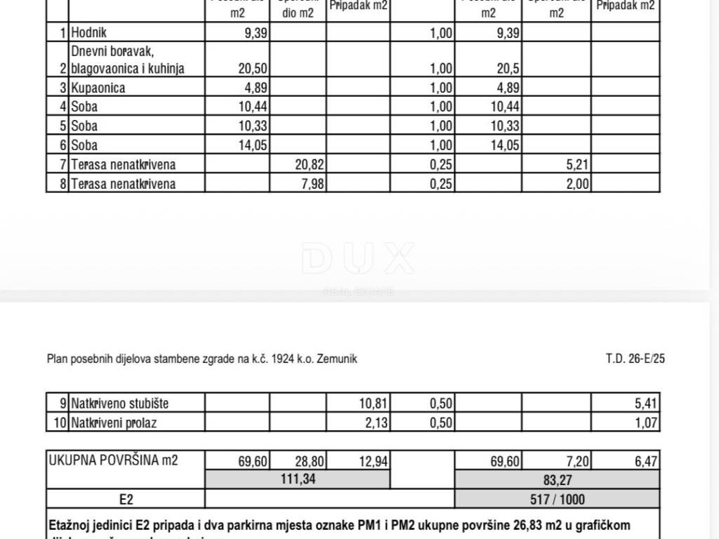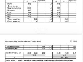 The apartment covers a total usable area of 69.60 m, and consists of a hallway, a spacious living room connected to the kitchen and dining room, three bedrooms and a bathroom. The apartment has two uncovered terraces with a total area of 28.80 m, as well as a staircase and a covered passage with an area of 12.94 m. The total usable area of the apartment with ancillary parts and accessories is 111.34 m, while the total usable area is 83.27 m.