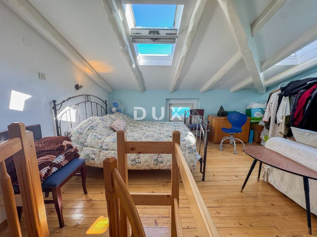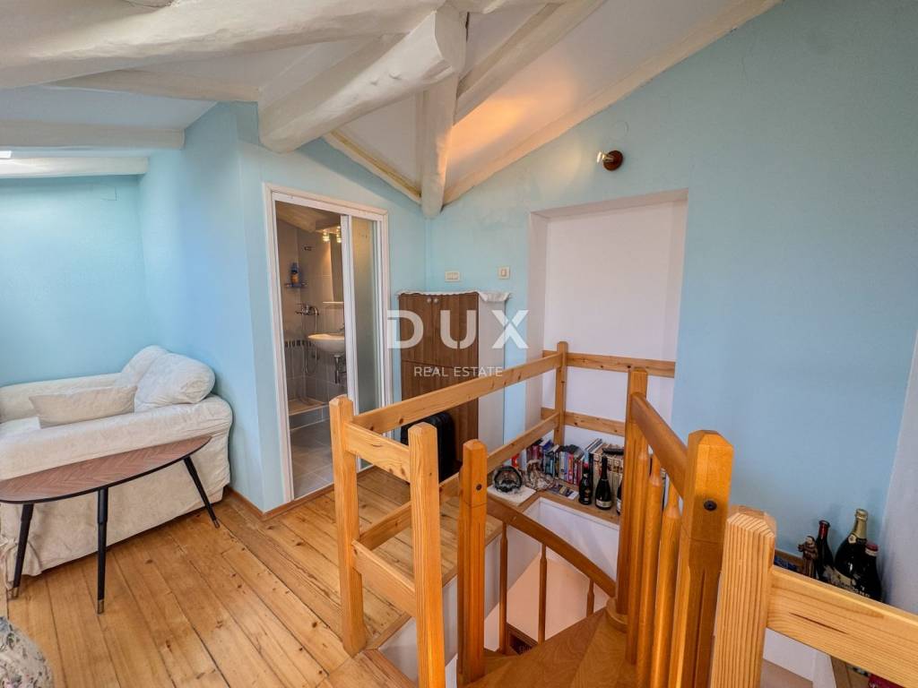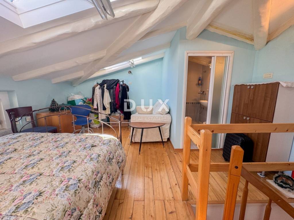 The apartment is located on the 3rd floor of an Austro-Hungarian villa and consists of a hallway, kitchen, large bathroom with window, spacious southern bedroom with its own balcony and sea view, and an open space living room with access to another balcony with a panoramic sea view. Spiral stairs lead to the attic, where there is a second bedroom with its own bathroom.
