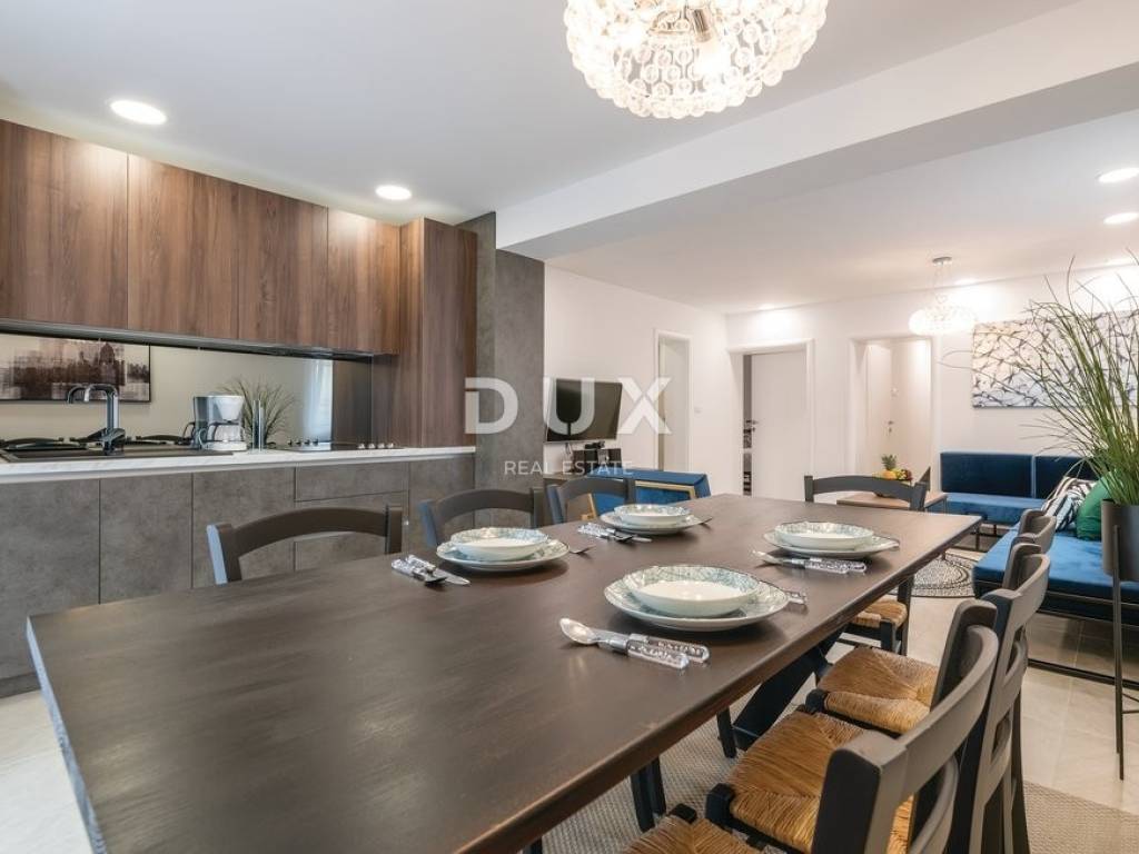 The apartment consists of a spacious open-space living room with kitchen and dining room, two modern bedrooms, two bathrooms, storage room, as well as a terrace with large garden furniture.