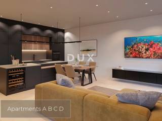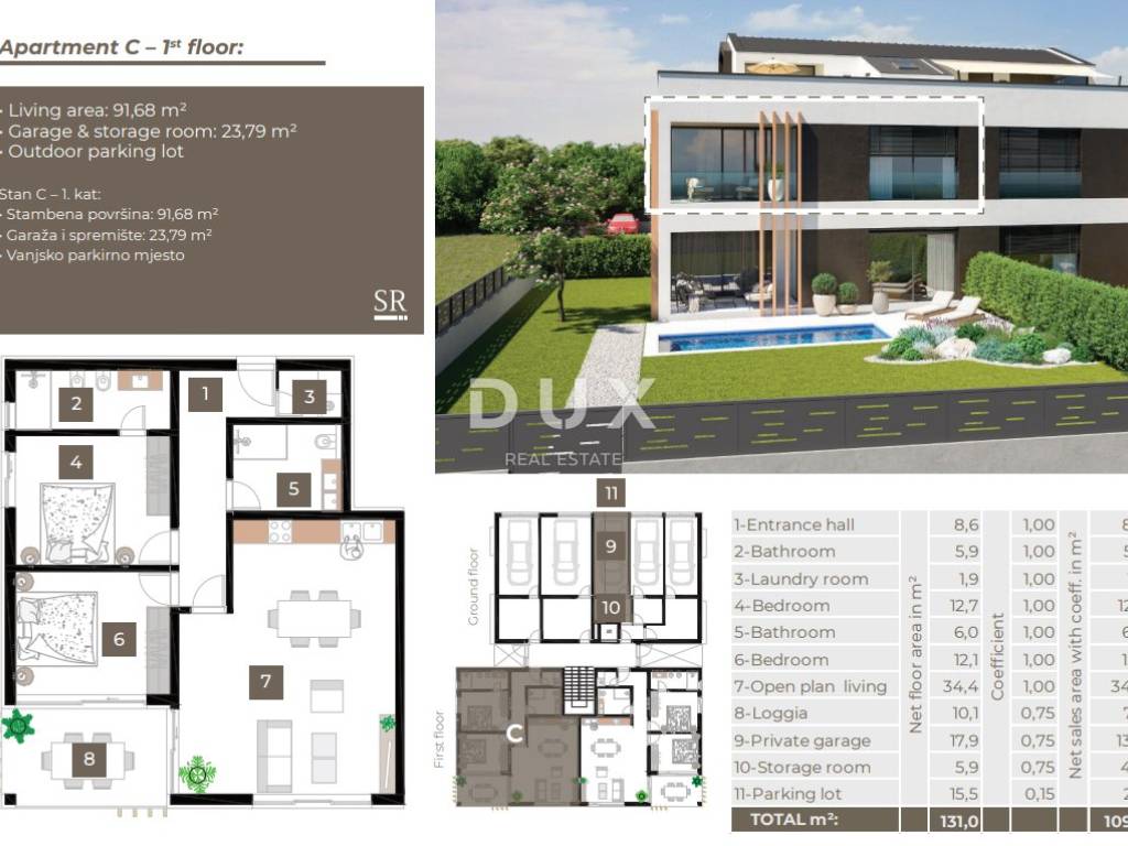Rovinj is today one of the most developed tourist destinations in Croatia. It is also known as one of the most picturesque and romantic towns in the Mediterranean, which has attracted a large number of tourists for decades, and most of them return year after year. The pleasant Mediterranean climate, carefully designed green areas, cleanliness and orderliness of the streets, the kindness of the local population and numerous events are characteristic of this historic town. The apartment is located on the first floor and consists of two bedrooms and two bathrooms, a spacious open-space area that includes a kitchen, dining room and living room, laundry room, loggia and storage room. The property includes a parking space and a garage, and is located just a few hundred meters from the sea. Apartment C 1st floor: Living area: 91.68 m Garage and storage room: 23.79 m Outdoor parking space