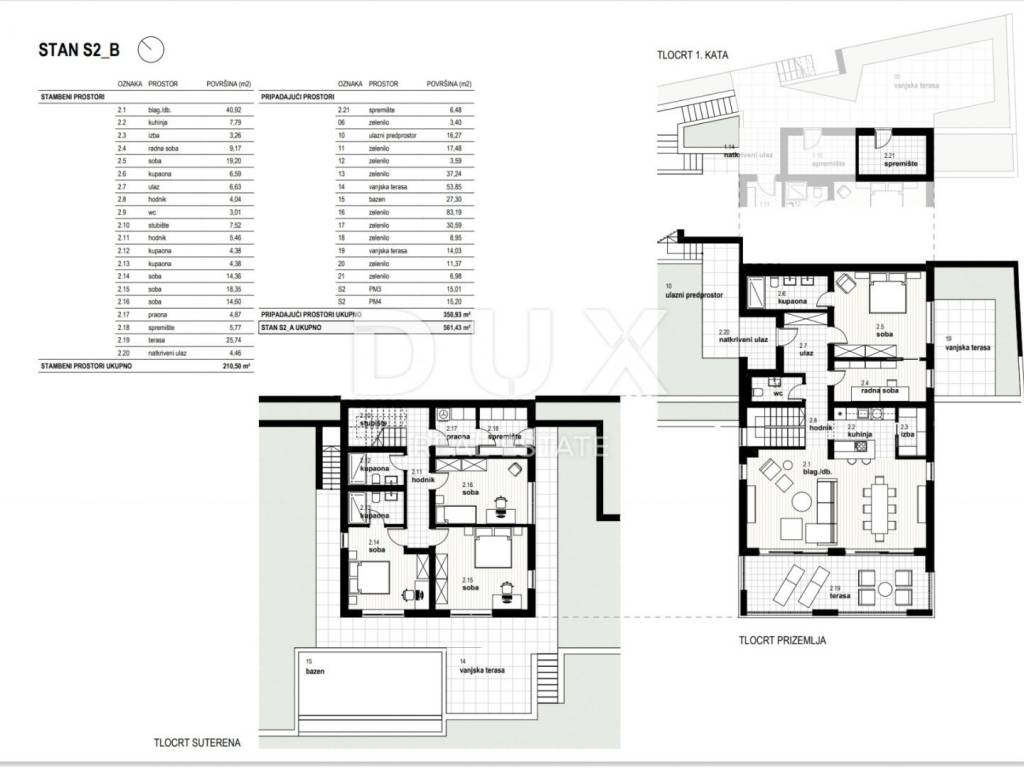We offer a property that offers you modern design and elegance, comfort and top-notch equipment, and is located in a beautiful quiet location near public transport, schools, kindergartens, shopping centers and a ten-minute drive from Rijeka. The complex of 4 residential buildings with a total of 8 apartments is located north of the Adriatic highway in the area of "Green Kostrena" from where there is a beautiful view of the entire Kvarner. In the immediate vicinity there are 10 kilometers of well-maintained walking, cycling and fitness trails that pass through the highest parts of Kostrena from the Solin peak to the Sopalj peak. Access to the houses is arranged from the upper road where the arrangement and expansion of the existing road is planned. Each house has four outdoor parking spaces, or two parking spaces per residential unit. Each house consists of two apartments. The apartments on the upper two plots are located one above the other, while the apartments on the lower two plots are located next to each other. Each apartment has a part of the garden. HOUSE B apartment S2 - B: LIVING SPACES: - living room / dining room 40.92 - kitchen 7.79 - pantry 3.26 - study 9.17 - room 19.20 - bathroom 6.59 - entrance 6.63 - hallway 4.04 - WC 3.01 - staircase 7.52 - hallway 5.46 - bathroom 4.38 - bathroom 4.38 - room 14.36 - room 18.35 - room 14.60 - laundry room 4.87 - storage room 5.77 - terrace 25.74 - covered entrance 4.46 LIVING SPACES TOTAL: 210.50 m ASSOCIATES SPACES: - storage room 6.48 - green space 3.40 - entrance hall 16.27 - green space 17.48 - greenery 3.59 - greenery 37.24 - outdoor terrace 53.85 - swimming pool 27.30 - greenery 83.19 - greenery 30.59 - greenery 8.95 - outdoor terrace 14.03 - greenery 11.37 - greenery 6.98 - parking space 3 15.01 - parking space 4 15.20 ASSOCIATES TOTAL: 350.93 m APARTMENT S2-B TOTAL: 561.43 m This luxurious apartment is designed for maximum comfort. EQUIPMENT: The house in which the apartment is located is well-built and luxuriously equipped, all built-in materials, floor and wall coverings are of the highest standards. - 10cm thick facade insulation - underfloor heating - heat pumps - top-quality aluminum joinery. The apartment has its own garden and 2 parking spaces. PRICE: The stated price refers to a completely completed property on a turnkey basis, without furniture. The price includes VAT, the buyer is exempt from paying real estate tax. In the case of purchase to a company registered in Croatia, a full VAT refund is possible after the sale. Clean and tidy property. Certainly a beautiful property for luxurious family life, but also suitable as an investment in the form of elite tourism. UNIQUE PROPERTY DEFINITELY WORTH YOUR ATTENTION IN A GREAT LOCATION!!! KOSTRENA Kostrena is an old popular seaside town, first mentioned at the beginning of the 15th century. It gained its first municipal independence in 1874, but retained it very briefly, only two years. It is divided into two parts, St. Lucia and St. Barbara, according to the names of two churches that exist in its area. Kostrena is located in the immediate vicinity of the city of Rijeka, framed by the Martinšćica Bay and the Bakar Bay. The Kostrena peninsula is about 10 kilometers long and slopes gently towards the coast. Along its entire length, there are beautiful beaches that are visited by thousands of swimmers during the summer. The most famous and most visited are those in the Žurkovo bay, then Smokvinovo, Svežanj, Spužvina, Podražica, Nova voda and Perilo. Kostrena consists of about twenty settlements, many of which were named after families, and today the most populated are Vrh Martinšćice, Glavani, Sv. Lucija, Rožmanići, Doričići and Paveki. The characteristic karst area with Mediterranean plants and the famous Kostrena gromača, and the mild climate that sometimes gives way to strong gusts of the bora, are the characteristics of this region.