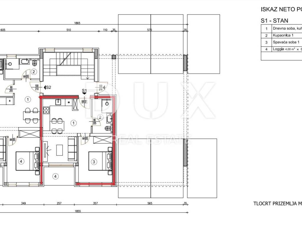 Pula lies in the southwestern part of the Istrian peninsula in a well-protected bay and is the largest city in Istria. It is known, like the rest of the region, for its mild climate, calm sea and untouched nature. The city has a long tradition of winemaking, fishing, shipbuilding and tourism, and is also a transit port. Pula has been the administrative center of Istria since Roman times. Today, around 67,000 inhabitants live in the city center, but the area that gravitates to it daily, and due to a combination of circumstances is not administratively included in the city, although, in fact, it is an integral part of it, has more than 100,000 inhabitants. On the outskirts of the city of Pula, in the Monte Turco settlement, this smaller residential building with a total of 6 residential units is located. The land on which it is located is 140m away from the main road, thus providing its new owners with peace and quiet when staying in the apartments or courtyards of their new residential units. The property in question is marked as S1 and is located on the ground floor. The total living area is 38.32m2 and consists of a small entrance hall, a living room connected to the kitchen and dining room, a bedroom, a bathroom and a terrace with access to a private garden, with a total area of 19.25m2. The total reduced area is 40.24m2. Each property is equipped with PVC joinery, electric underfloor heating which is installed in the bathroom, while the rest of the apartment is heated and cooled by inverter air conditioners. The floor coverings are high-quality laminate and tiles that future owners have the option of choosing within the investor's budget. Each residential unit has its own parking space. New construction can also be purchased through a loan in the following way: - 50% of the apartment value is paid immediately upon agreement with the investor - 50% of the apartment value can be financed through a loan after completion of the works and obtaining the necessary documentation for its realization. The planned start of construction is 15.9.2025. year, while the completion of the works is scheduled for a year later, i.e. September 15, 2026. For all additional information about the property, and to arrange a viewing, please contact your agent!