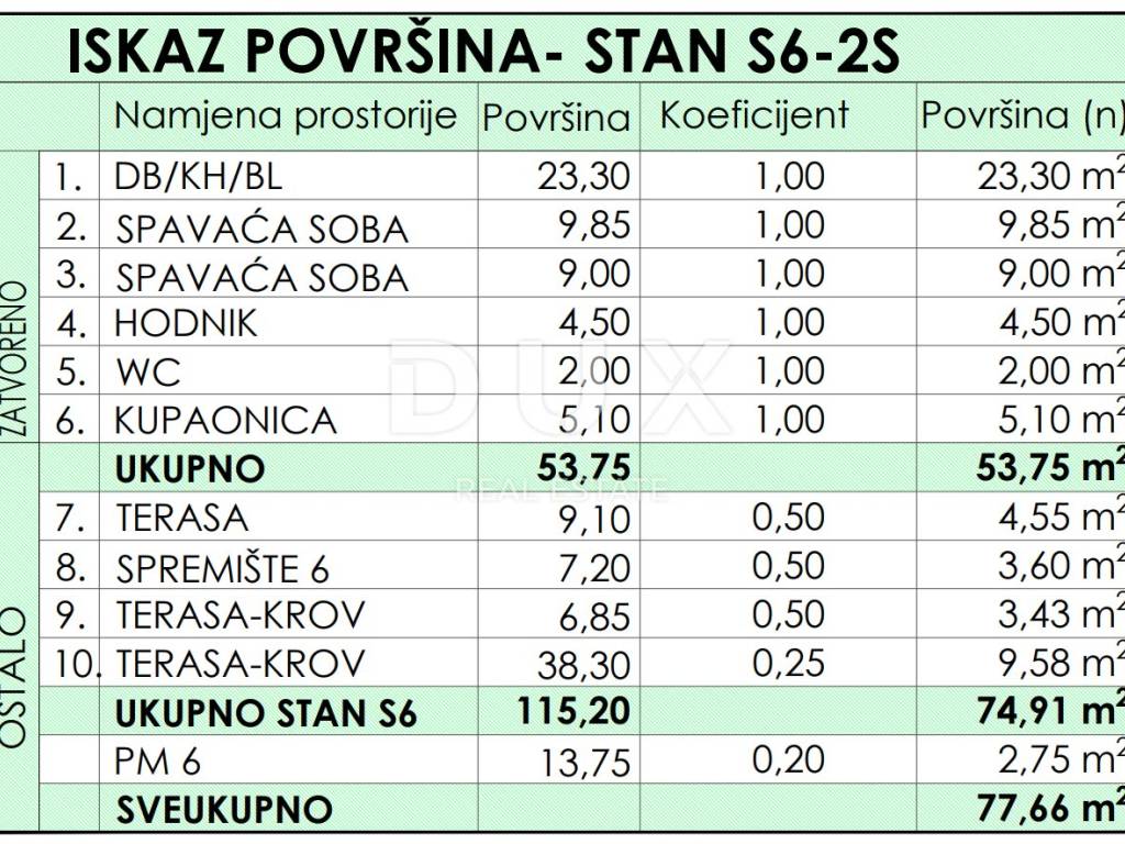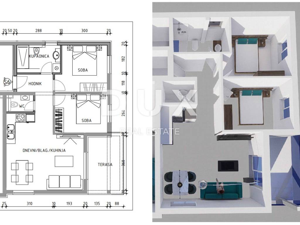 For sale are top-quality apartments in a new building located in a quiet and picturesque place of Ražanac, ideal for living, vacation or investment. The building has a total of six modernly designed apartments, each with its own storage room in the basement and its own parking space. They are only 320 meters away from the pebble beach with a view of Velebit. The building is equipped with an elevator, and all apartments have underfloor heating throughout, which guarantees a pleasant temperature throughout the year. Each unit also has built-in air conditioning in all rooms, which further contributes to comfort. Apartment S6 on the second floor offers the perfect combination of functionality and comfort it consists of two bedrooms, a modern bathroom, an additional toilet, a spacious living room with a kitchen and dining room, a covered terrace and an additional roof terrace with a beautiful view of the sea. The planned completion is by the end of 2025. Ražanac is a charming Dalmatian town that combines peace, nature and traditional Mediterranean spirit. Its beaches are known for their exceptional cleanliness and spectacular views of the mighty Velebit, creating breathtaking scenes. It is ideal for anyone looking for an escape from the hustle and bustle of everyday life and want to enjoy an authentic coastal ambiance. For more information or a viewing, please feel free to contact us - the apartments are ready to move in, and this opportunity rarely comes along.