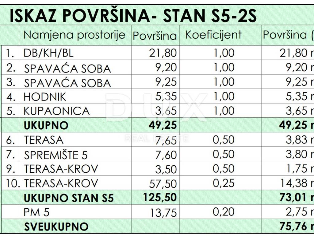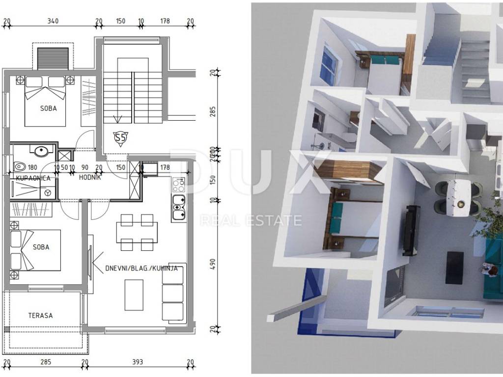 For sale are top-quality apartments in a new building located in the quiet and picturesque town of Ražanac, ideal for living, vacation or investment. The building has a total of six modernly designed apartments, each with its own storage room in the basement and its own parking space. They are only 320 meters from the pebble beach with a view of Velebit. The building is equipped with an elevator, and all apartments have underfloor heating throughout, which guarantees a pleasant temperature throughout the year. Each unit also has built-in air conditioning in all rooms, which further contributes to comfort. Apartment S5 on the second floor offers the perfect combination of functionality and comfort it consists of two bedrooms, a modern bathroom, a spacious living room with kitchen and dining room, a covered terrace and an additional roof terrace with a beautiful view of the sea. The planned completion is by the end of 2025. Ražanac is a charming Dalmatian town that combines peace, nature and the traditional Mediterranean spirit. Its beaches are known for their exceptional cleanliness and spectacular views of the mighty Velebit mountain, creating breathtaking scenes. It is ideal for anyone looking for an escape from the hustle and bustle of everyday life and wanting to enjoy an authentic coastal ambience. For more information or a viewing, please feel free to contact us the apartments are ready to move in, and this opportunity rarely comes along.