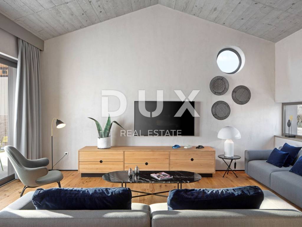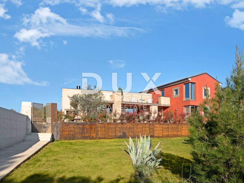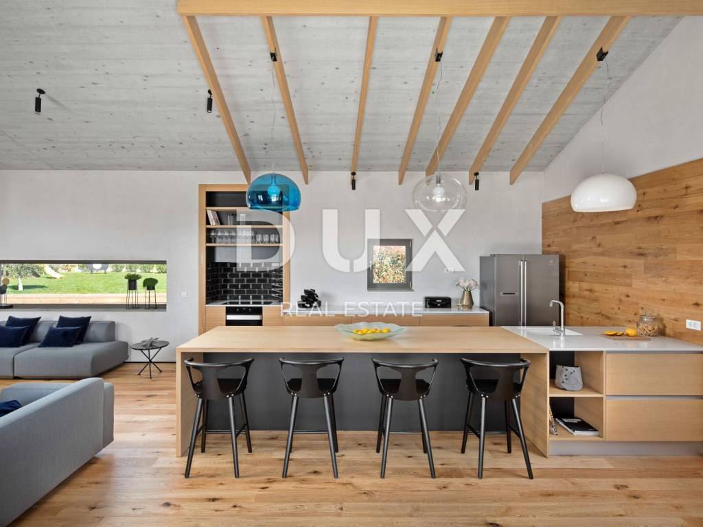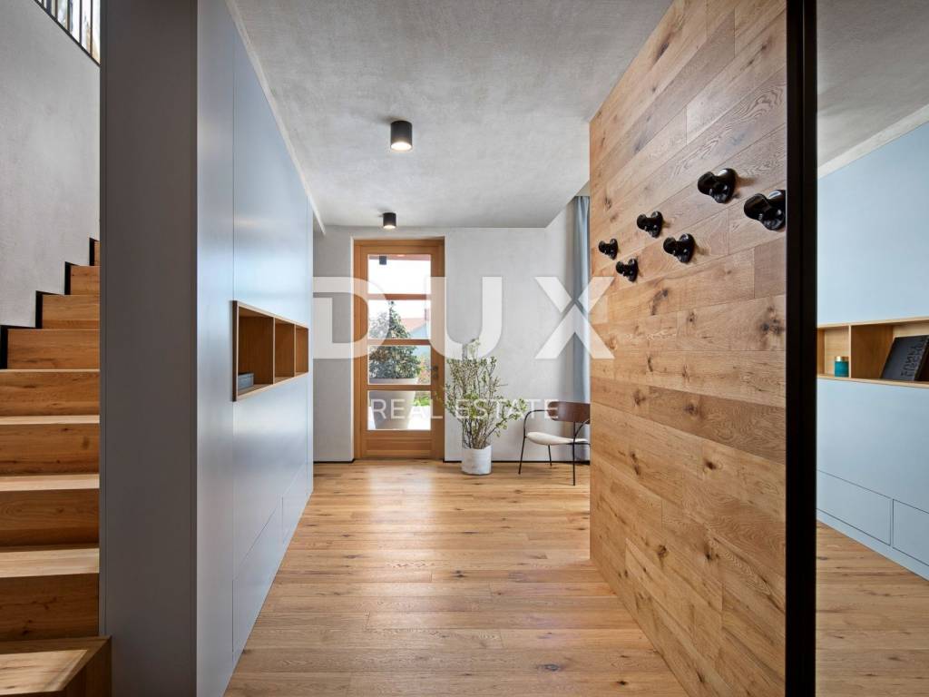 The house, a modern breakthrough in timeless architecture with an emphasis on functionality and aesthetics, fits into the settlement and landscape in terms of form and color, is divided into two floors of a functional floor plan, and the living area offers a harmonious living environment bathed in natural light that exudes sophistication and comfort.