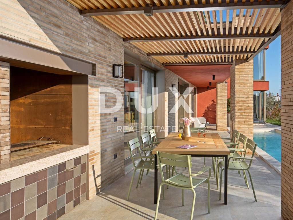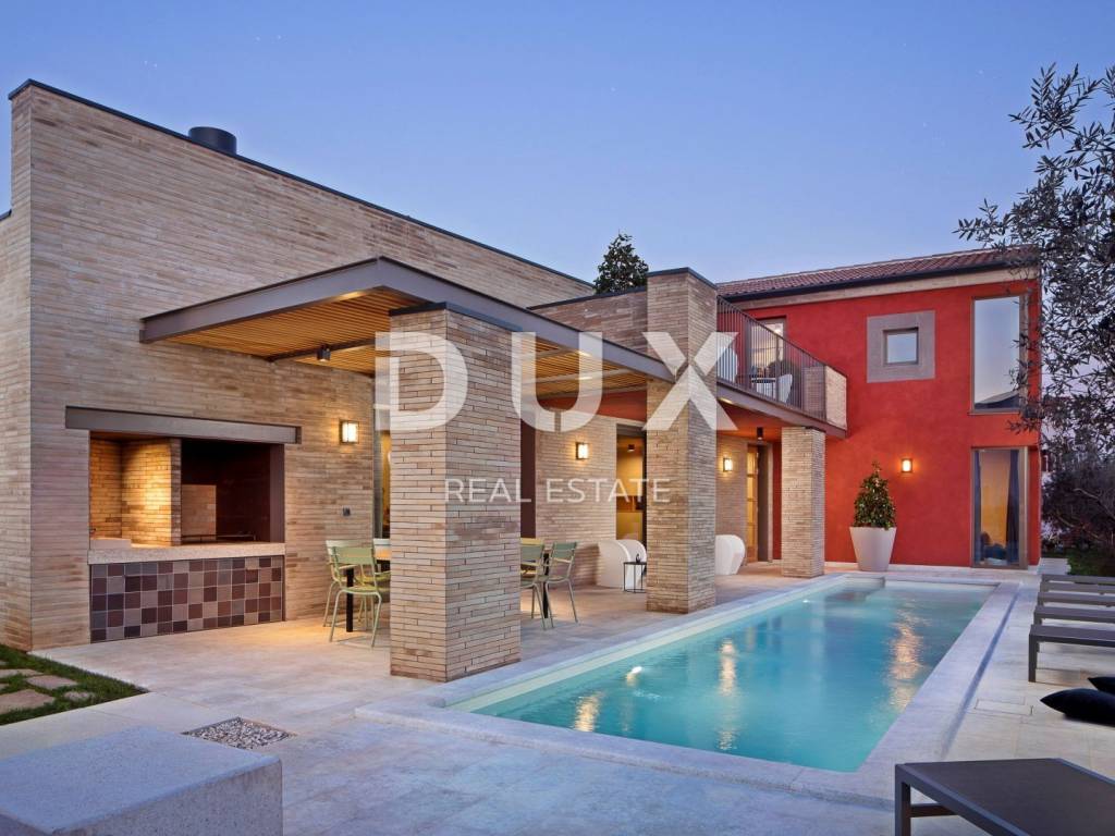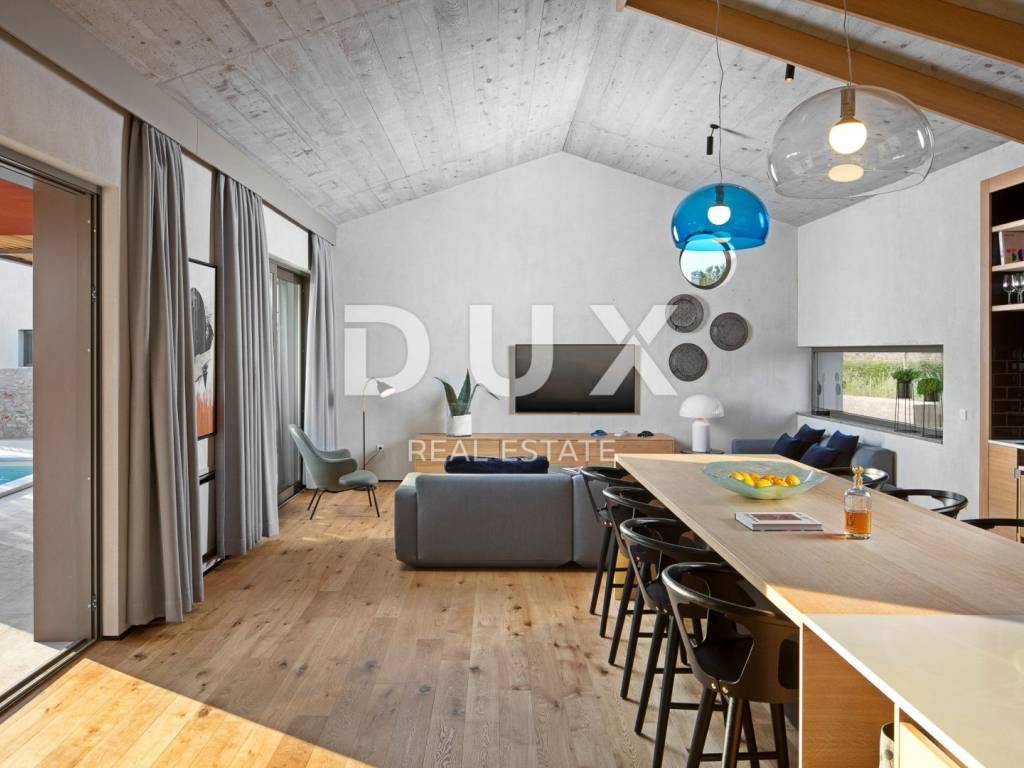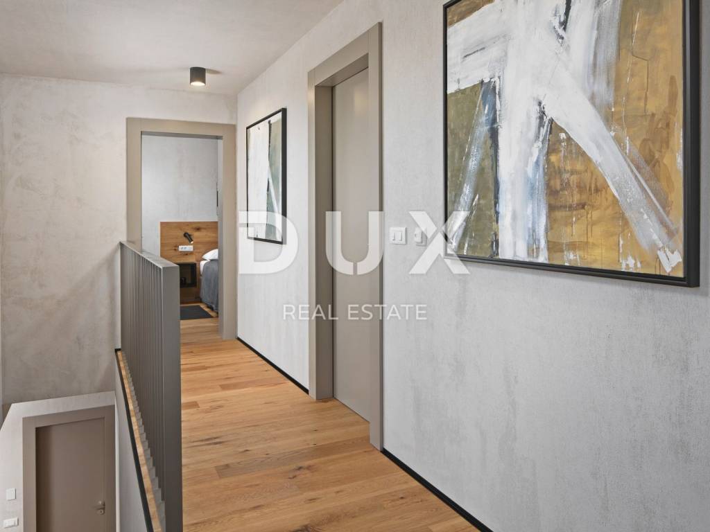 The house, a modern breakthrough in timeless architecture with an emphasis on functionality and aesthetics, fits into the settlement and landscape in terms of form and color, is divided into two floors of a functional floor plan, and the living area offers a harmonious living environment bathed in natural light that exudes sophistication and comfort.