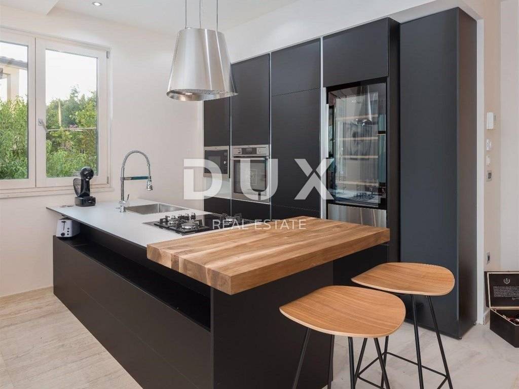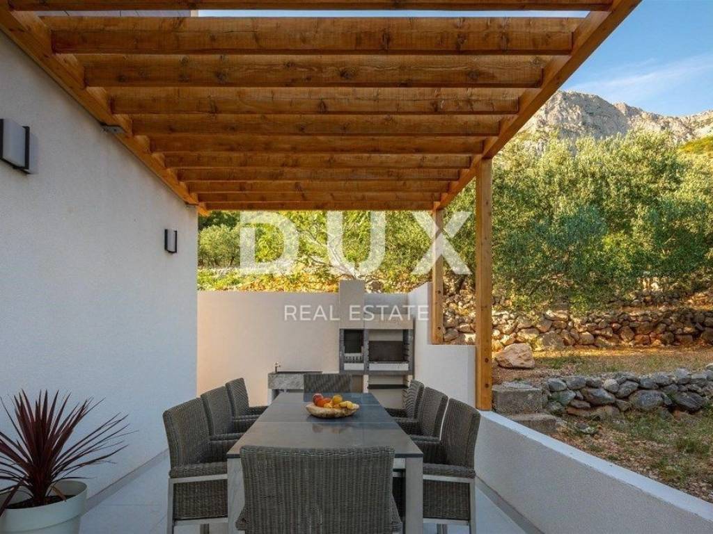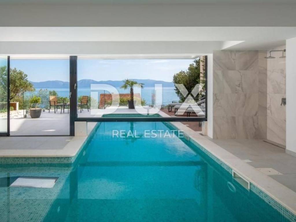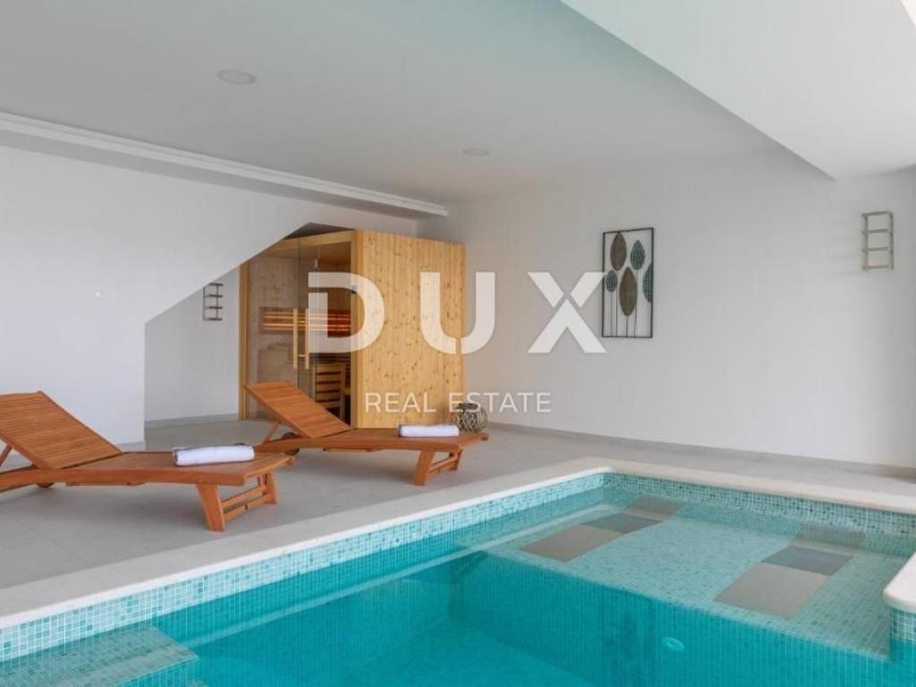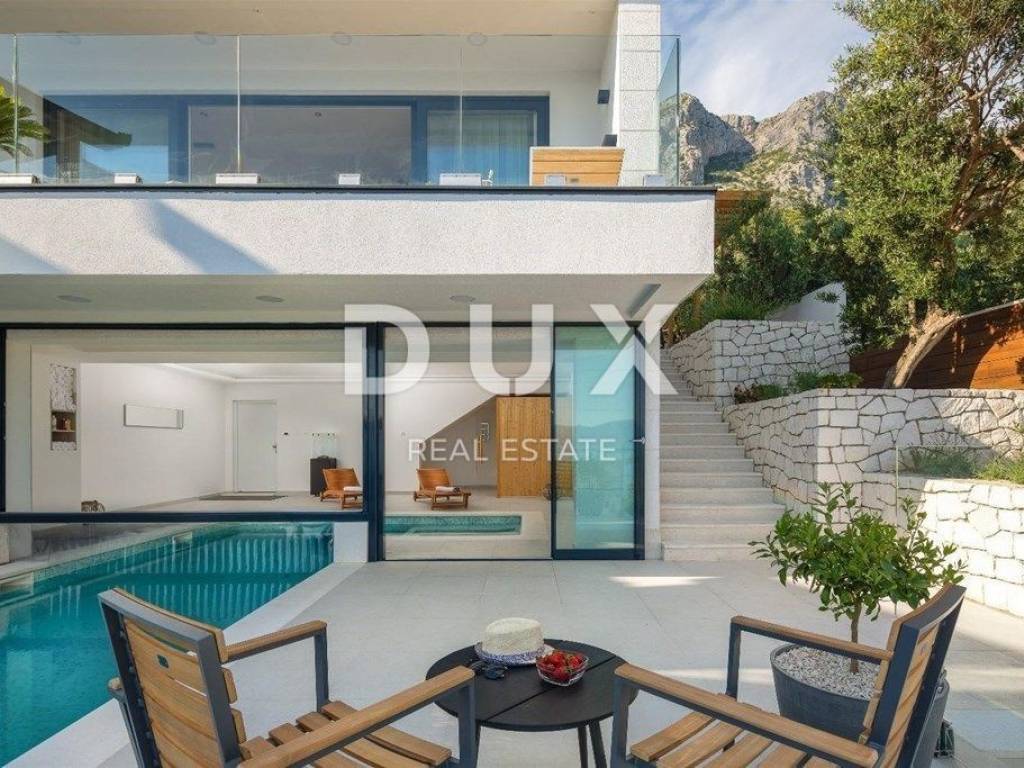 On the Adriatic highway, between Makarska and Ploče, there is a small but touristic place called Podaca. The villa is located on the Makarska Riviera, otherwise known for its numerous coastal places adorned with beautiful pebble beaches on one side, and the Biokovo mountain, as a proud guardian on the other. The villa is located only 70 meters from the sea, which offers a view of the endless blue from all floors. The villa is equipped with the most luxurious materials. The entrance to the villa is paved with Semmelrock slabs, and also serves as a parking lot. There is space for a garage upgrade, at the request of the future owners. External stairs lead to the middle floor of the villa, or the ground floor. The front door, as well as all other external doors of the house, are Hormann. In front of the entrance there is a grill area with an outdoor dining area. The ground floor consists of a living area and a double bedroom with its own indoor open bathroom with a bathtub. The living area contains a guest toilet, a living room equipped with Natuzzi furniture, which is warmed by a fireplace and a beautiful console table with a stone base, which is the work of the owner himself. The dining room is decorated with a handmade wooden table with modern chairs, and the open-plan kitchen with an island is fully equipped with AEG appliances. In addition to the hood, the kitchen has additional ventilation, which is also stretched throughout the villa. From the living room, through glass walls that completely eliminate external noise, you can exit to a beautiful, spacious balcony, which offers a view of the pool downwards, and a view of the sea in the distance. The balcony is equipped with outdoor lounge furniture. From the ground floor, as the center of the villa, internal stairs lead to the spa area, which opens onto a terrace with a sunbathing area. The pool is both outdoor and indoor, and the structure that divides it is mobile, so it is completely open in summer, and allows indoor swimming in winter. In addition, the pool is heated, and has a massage system and an electrolysis system. This area also includes a Finnish sauna, an indoor shower and a freestanding fireplace for a special atmosphere. The pool offers a view of the sea. The living room floor is covered with Travertine stone, as well as wide, beautifully lit stairs leading to the first floor. On the first floor there are three bedrooms, each with its own bathroom, two of which share a spacious balcony with a beautiful view. The bedrooms are equipped with custom-made beds, built-in wardrobes and blackout curtains. Underfloor heating has been implemented throughout the villa via heat pumps, and each floor of the villa has its own electrical cabinet and heating and cooling system. The villa is equipped with a solar system. The facade of the villa is excellently insulated, ventilated and decorated with first-class stone. As for horticulture, the owners have planted oranges, limes, lemons, lavender and olives. There is no construction zone on the left side of the villa, so you can count on long-term privacy.