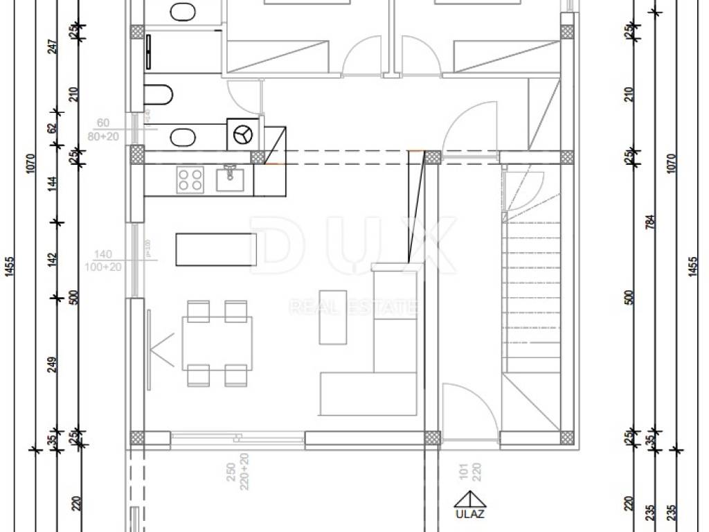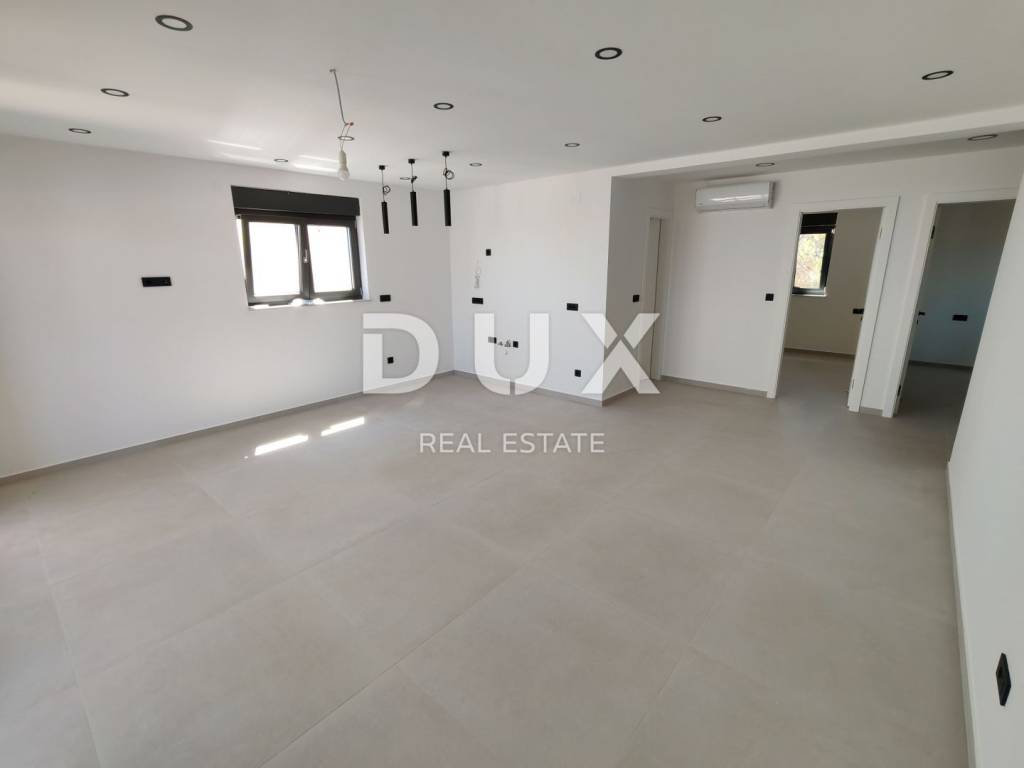 A luxurious apartment on the ground floor is for sale in one of the most sought-after locations on Vir, just 160 meters from the beautiful Jadro beach. In a quiet cul-de-sac, located in the very heart of Vir, this new building offers an extraordinary opportunity for those looking for the perfect combination of comfort and luxury. The 78.20 m2 apartment has been carefully designed to provide maximum comfort and functionality. It consists of a spacious hallway, two elegant bedrooms, one of which has a private bathroom, additional bathrooms, a modern kitchen connected to the dining room and living room, and a spacious terrace ideal for relaxation. Special attention is paid to the quality of construction and finishing details. There are premium anthracite plastic carpentry with three-layer glass, electric blinds, mosquito nets, as well as premium aluminum entrance doors to the building. The facade is insulated with 10 cm Styrofoam, while the terraces are covered with elegant travertine stone. A black fence made of two-layer tempered glass, handmade interior joinery, high-quality ceramics measuring 90 90 cm throughout the apartment, and luxurious bathroom elements from the brands Geberit, Grohe and Aquaestil ensure a high standard of living. Additional comfort includes electric floor heating in the bathrooms, air conditioners in the bedrooms and living room, anti-burglary and fire-resistant entrance doors to the apartments, as well as a video intercom. Knauf ceilings with built-in LED lighting, both working and ambient, further emphasize the sophistication of the space, while LED strips on the terraces create a pleasant atmosphere for evening get-togethers. The apartment also has a practical storage room under the stairs, equipped for a washing machine, and one parking space. This unique opportunity is exempt from real estate tax, and the completion of the construction of buildings A and B is planned for the beginning of 2025, while the completion of building C is expected in the fall of the same year. Don't miss the opportunity! Contact us and arrange a viewing of this extraordinary apartment that can become your new home or an ideal vacation spot.