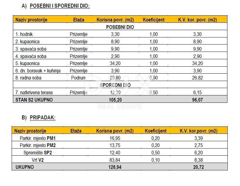 A modern apartment under construction in Sukošan near Zadar is for sale. The apartment with a total living area of 96.07 m2 is located on the ground floor of a smaller residential building with 6 units. The apartment consists of a living room, kitchen and dining room, two bedrooms and two bathrooms on the ground floor with a total area of 63.10 m2, a covered terrace of 12.30 m2, and a spacious study/tavern of 29.80 m2 in the basement of the building. The apartment also has two outdoor parking spaces and a storage room in the basement of the building, so the total useful value of the apartment area is 116.79 m2. The apartment is fully air-conditioned and has underfloor heating. High-quality materials were used in the construction, such as reinforced concrete construction and thermal insulation on the stone wool facade. First-class ceramics were used for the floor coverings, and the rooms have three-layer parquet. The carpentry is aluminum, and electric blinds and mosquito nets are installed. The planned construction completion date is mid-2025. The facility is 250 m away from the popular Children's Paradise beach. The town of Sukošan is a small maritime town near Zadar with a marina, so it is a true paradise for sailors. In the surrounding area there are many other picturesque coastal towns such as Bibinje, Turnje or the historic town of Biograd na Moru. The urban center, the city of Zadar, is 15 km away, and the nearest airport is only 10 km from the property. Thanks to its position in the center of Northern Dalmatia, it provides access to numerous islands in Zadar's waters, as well as proximity to various national parks and nature parks. For example, the Vrana Lake Nature Park is located nearby, as is the Kornati National Park, an archipelago of impressive geography with 89 islands, islets and rocks. "Dear clients, the agency commission is charged in accordance with the General Business Terms and Conditions" www.dux-nekretnine.hr/opci-uvjeti-poslovanja