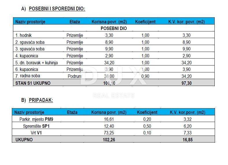 A modern apartment under construction in Sukošan near Zadar is for sale. The apartment with a total living area of 97.30 m2 is located on the ground floor of a smaller residential building with 6 units. The apartment consists of a living room, kitchen and dining room, two bedrooms and two bathrooms on the ground floor with a total area of 63.10 m2, and a spacious study/tavern of 38 m2 in the basement of the building. The apartment also has a garden of 73.25 m2, one outdoor parking space and a storage room in the basement of the building, so the total usable area of the apartment is 114.15 m2. The apartment is fully air-conditioned and has underfloor heating. High-quality materials were used in the construction, such as reinforced concrete construction and thermal insulation on the stone wool facade. First-class ceramics were used for the floor coverings, and the rooms have three-layer parquet. The carpentry is aluminum, and electric blinds and mosquito nets are installed. The planned construction completion date is mid-2025. The facility is 250 m from the popular Children's Paradise beach. The town of Sukošan is a small maritime town near Zadar with a marina, so it is a real paradise for sailors. In the surrounding area there are many other picturesque coastal towns such as Bibinje, Turnje or the historic town of Biograd na Moru. The urban center, the city of Zadar, is 15 km away, and the nearest airport is only 10 km from the property. Thanks to its position in the center of Northern Dalmatia, it provides access to numerous islands in Zadar's waters, as well as proximity to various national parks and nature parks. For example, the Vrana Lake Nature Park is located nearby, as is the Kornati National Park, an archipelago of impressive geography with 89 islands, islets and rocks. "Dear clients, the agency commission is charged in accordance with the General Business Terms and Conditions" www.dux-nekretnine.hr/opci-uvjeti-poslovanja