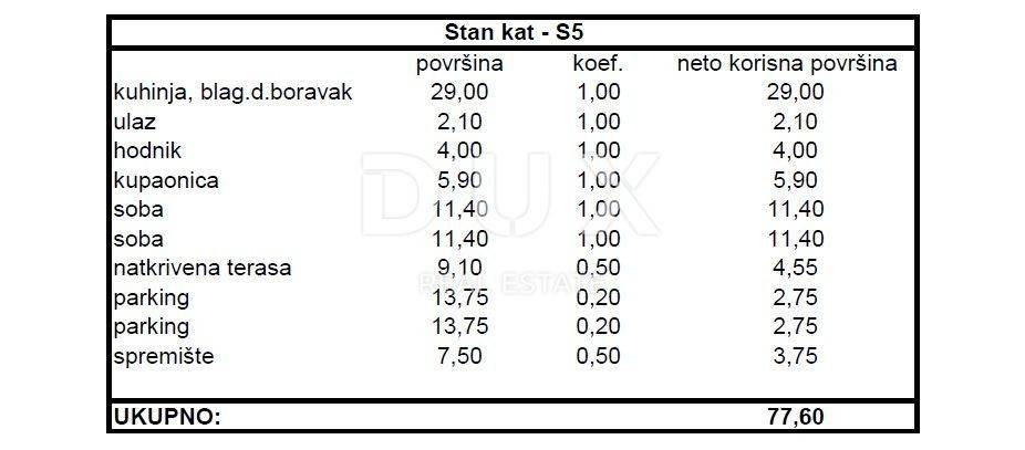 A modern apartment under construction in the Skročini area of Zadar is for sale. The apartment with a living area of 63.80 m2 is located on the first floor of a smaller residential building with eight units. It consists of two bedrooms, living room, kitchen and dining room, hallway and bathroom. The apartment has a covered terrace, a storage room in the basement, and two outdoor parking spaces. The total useful value of the area of the apartment together with all accessories is 77.60 m2. The apartment is air-conditioned, and high-quality materials were used in the construction, such as thermal insulation on the facade, 10 cm styrofoam. Parquet and ceramic tiles were used for the floor coverings, and the joinery is PVC. The planned construction completion date is 2025. All necessary facilities for everyday life are nearby, such as shops, schools, kindergartens or shopping centers. The city center is a 30-minute walk away, and the nearest and oldest city beach, Marex, is a 20-minute walk away. Zadar is the urban center of Northern Dalmatia, which, due to its favorable position in the central part of the Adriatic coast, is becoming the most visited tourist destination in Dalmatia. In addition to numerous attractions and rich content, Zadar is located near various National Parks such as Kornati and picturesque towns on the Adriatic coast such as Nin, Biograd na Moru and others.