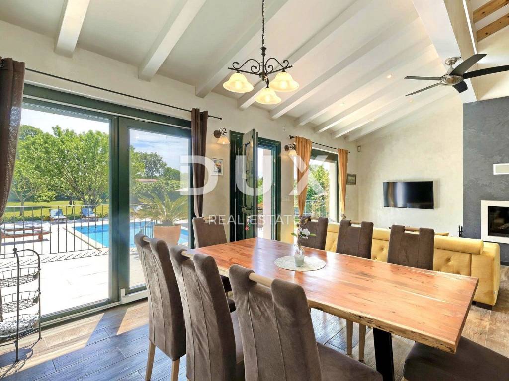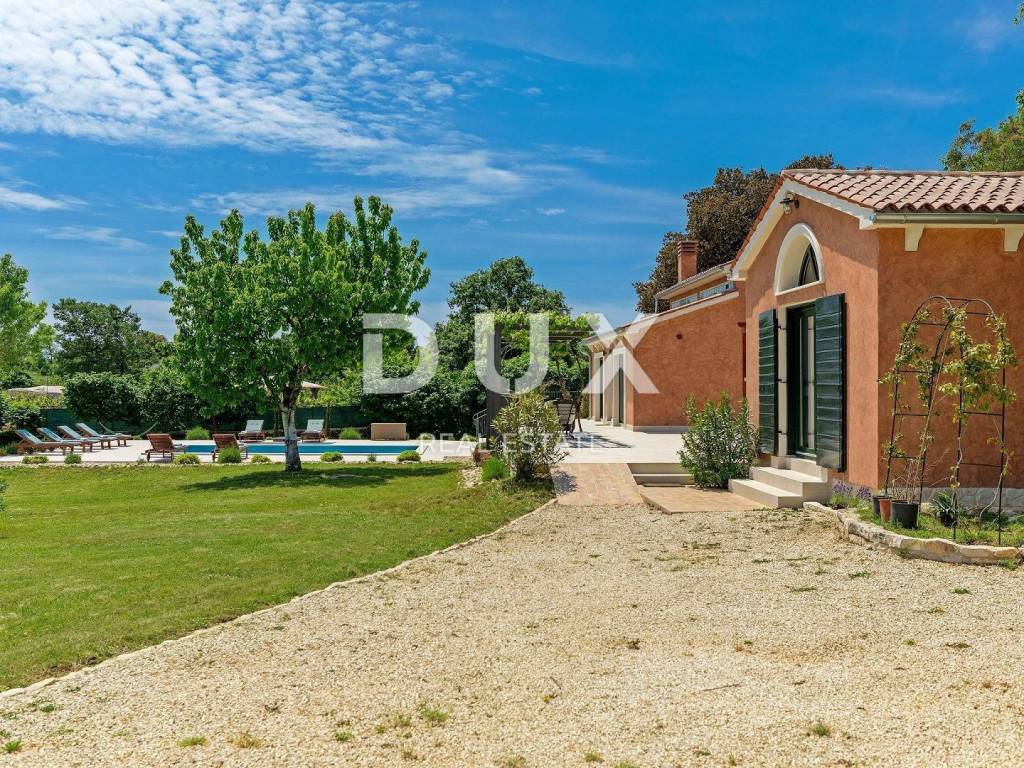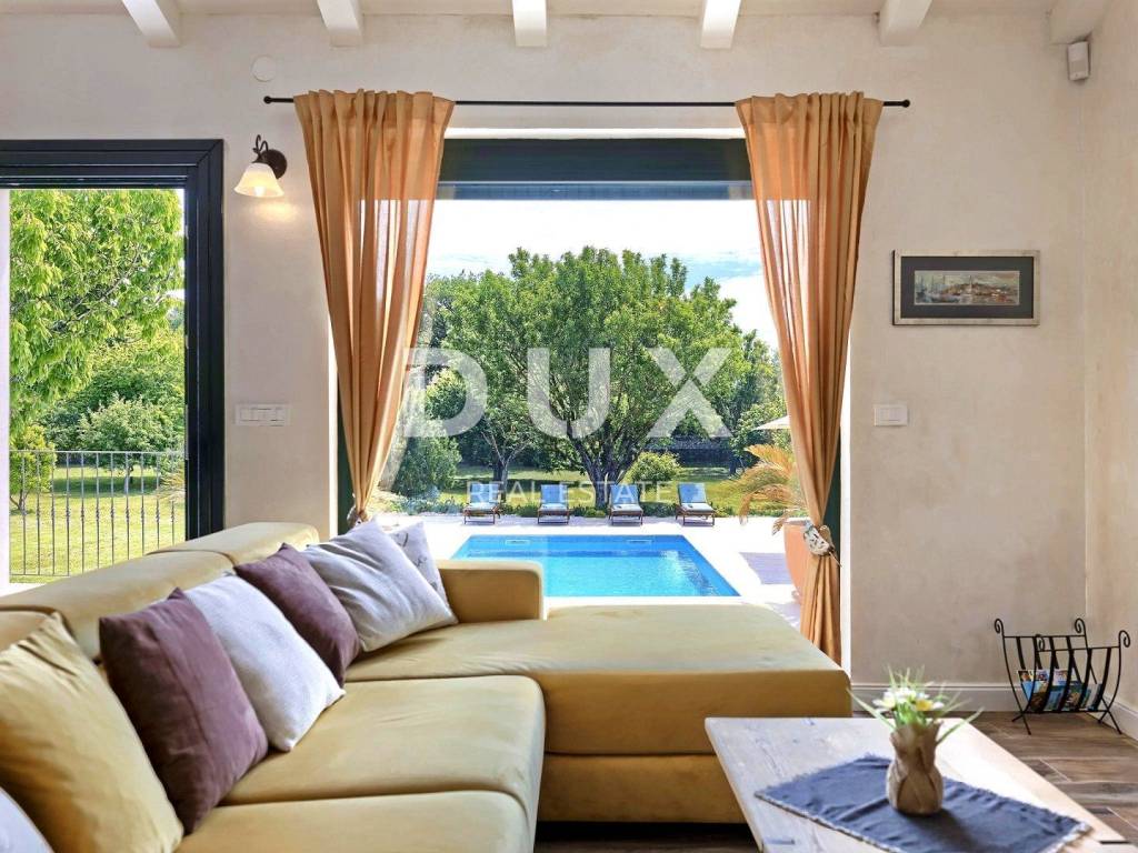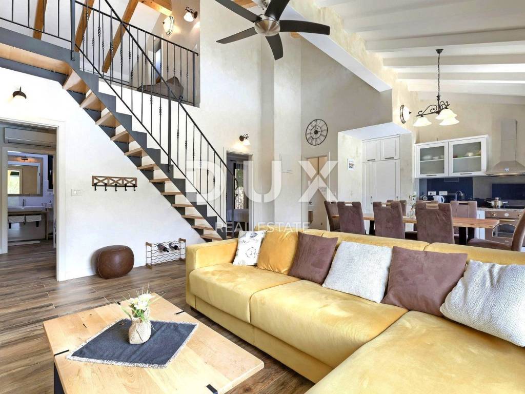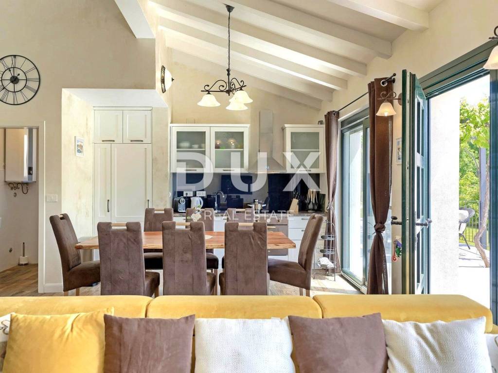 The most attractive picturesque Istrian town of Rovinj, with its old town center under UNESCO protection, is an eternal inspiration for romantics and artists and one of the most developed tourist destinations in Croatia. It is located on the west coast of Istria and is adorned by a distinctly indented archipelago with as many as 14 islets and 6 rocks along 67 kilometers of coastline, which is a protected natural heritage. A beautiful indented coast, a specific mild Mediterranean microclimate, an excellent gastronomic offer, year-round cultural events and nice and friendly hosts make this small town magical. Surrounded by greenery in a gentle neighborhood in the suburbs of magical Rovinj, an oasis of comfort and peace near the beach is for sale. The harmonious property consists of a main house, a guest house and a swimming pool, and in addition to the microlocation, the property is also distinguished by the quality of its construction, which guarantees long-term satisfaction and quality of living. Houses of timeless design fit in shape and color into the village and the landscape, and each house is conceived as a tastefully decorated and well-equipped residential unit. The main house extends over two floors. The ground floor consists of an open concept space that unites the kitchen, dining room and living room, a guest toilet and two bedrooms with their own bathrooms. The loft consists of a gallery space and a bedroom with its own bathroom. The guest house extends over one floor and consists of a living room with a kitchen, a bedroom and a bathroom. Between the houses there is a summer dining room covered with a pergola and an open fireplace, and the perfect harmony is rounded off by a 32 m saltwater swimming pool with a sun deck. The spacious garden is completely fenced, equipped with automatic irrigation and enriched with olives, fruit trees and various indigenous herbs and plants. This rarity on the market is an ideal opportunity for a comfortable family life as well as an investment for the purpose of an already established tourist rental. Dear clients, the agency commission is charged in accordance with the General Business Conditions: www.dux-nekretnine.hr/opci-uvjeti-poslovanja