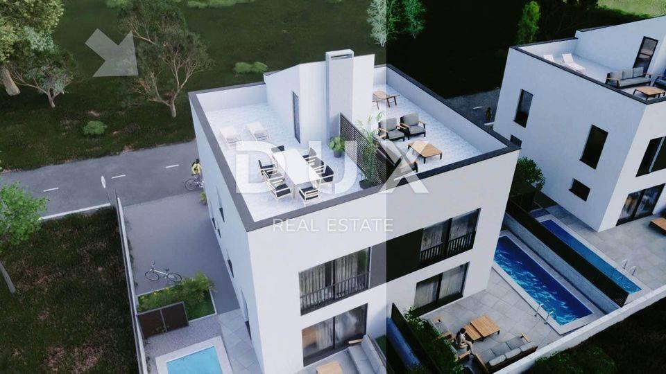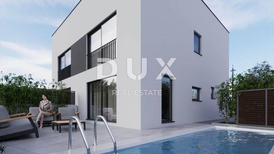 The village of Peroj, located on the southwest coast of southern Istria with a beautiful view of the Fažana Channel and the Brijuni archipelago, is ten kilometers from the 3,000-year-old Pula, five kilometers from Vodnjan and thirty kilometers from Rovinj. A semi-detached house with a swimming pool is for sale in the Peroj settlement. It consists of the ground floor, which is designed as a living space, in which there is a kitchen, a living room, a bathroom and one bedroom with an exit to the garden. On the first floor there are two bedrooms and a bathroom, and access to the roof with a roof terrace with a beautiful view of the sea. A project with modern and simple lines. The size of the pool is 17.50 m2 on a fenced plot of 90 m2. During construction, modern and high-quality materials will be used. The customer can participate in the construction itself in terms of choosing materials and colors and choosing equipment. The price is for a turnkey property.