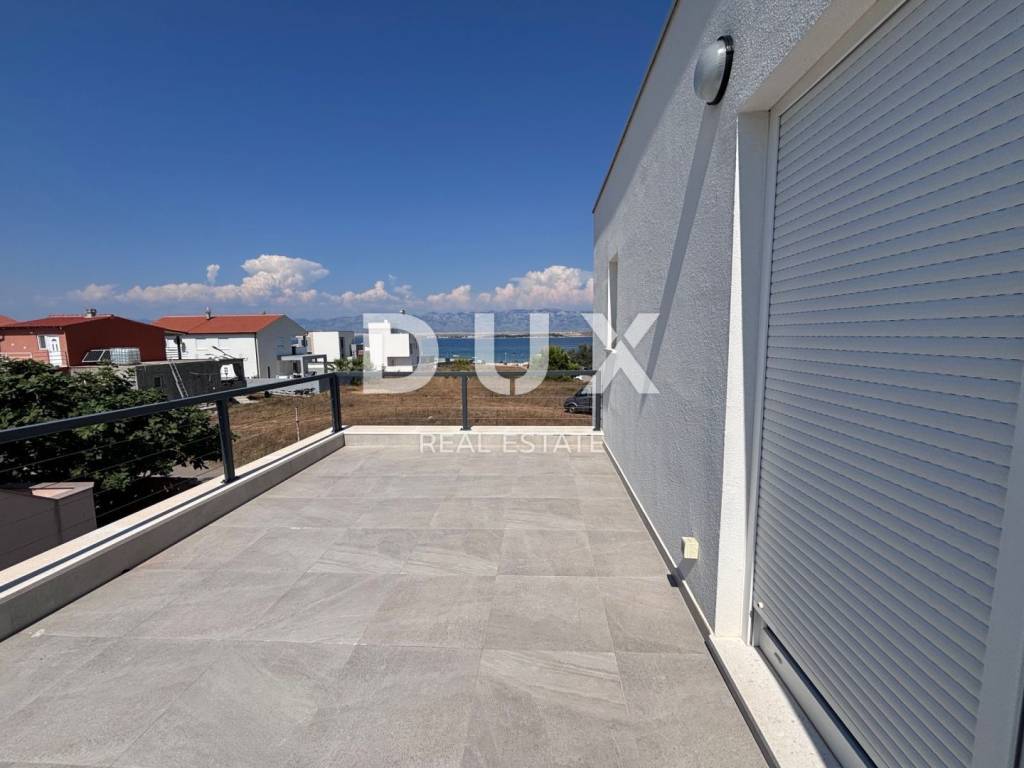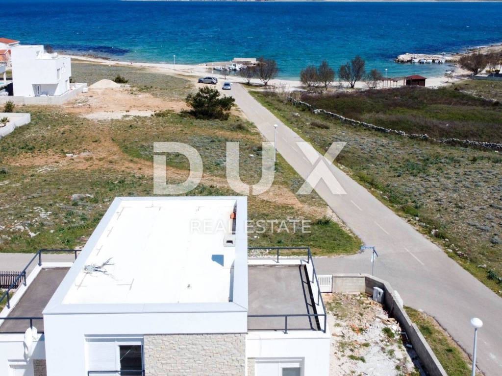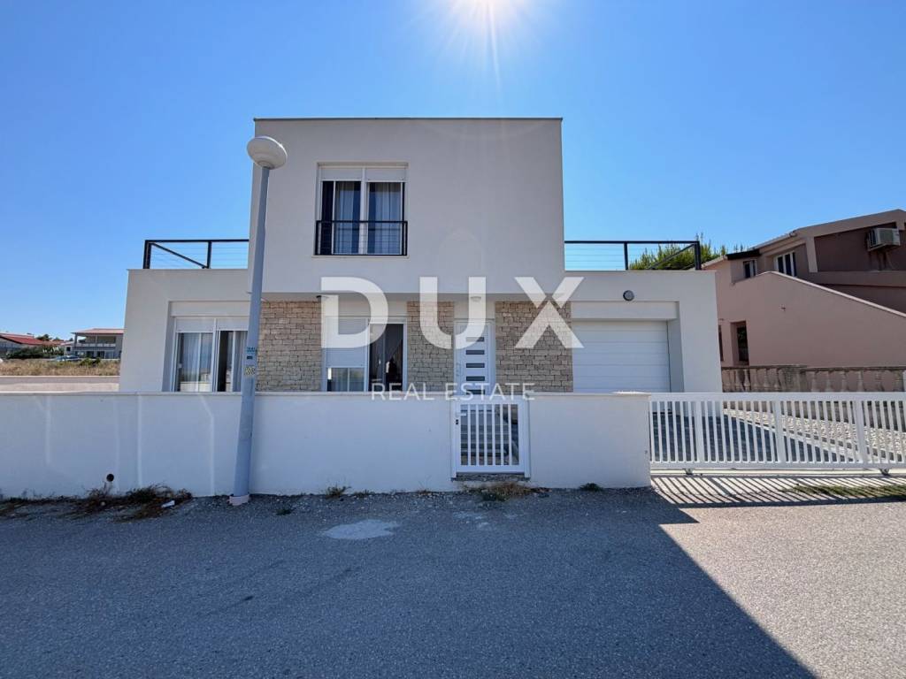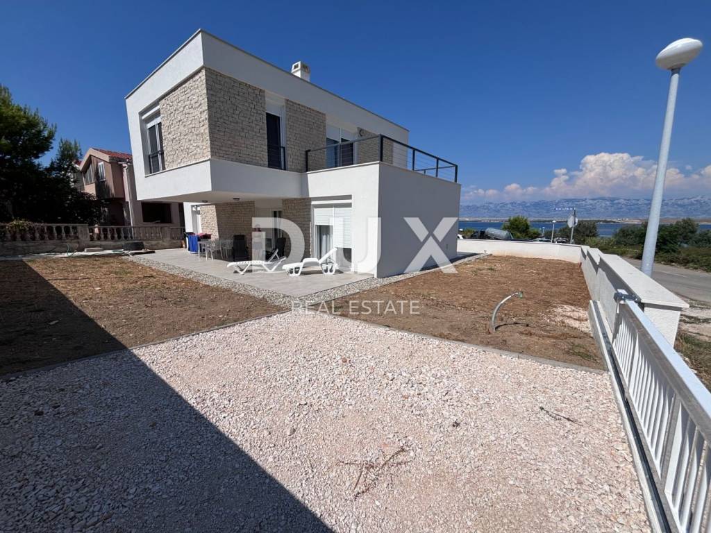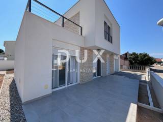 A luxurious, modern house for sale, newly built on the island of Vir in an exceptional location - 100 m away from one of the most beautiful beaches on the island, and the position of the house is additionally attractive because there are streets on three sides of the plot with a total area of 370 m2, while the house itself is on the fourth side more than 3 m from the neighboring house. The house consists of a garage (19.6 m2) and a residential part on the ground floor (residential part 48 m2 + terrace 68.10 m2) and on the first floor (area 53 m2 + balcony 36.10 m2). The ground floor consists of an entrance area, a storage room, a toilet and an open area where the living room, kitchen and dining room are located. The ground floor leads to two spacious terraces, on the south and north. On the first floor there are two balconies with an unobstructed view of the sea, a bathroom and three bedrooms, one of which has its own bathroom and a beautiful view of the sea. The air conditioning system is designed so that each indoor unit has its own outdoor unit. The house has a chimney and underfloor heating in the bathrooms. Among the equipment, we highlight top-quality ceramics (Ceramiche Piemme), first-class parquet made of bleached, brushed oak (Tarkett), Trogir plano stone, Rehau PVC carpentry with blinds and mosquito nets, Laufen and Aquestil sanitary ware, Hörmann garage door with remote control. The flat roof is made with the Draco system, the Benkovac Ben stone is on the facade, thermal insulation is 10 cm and 20 cm thick, which, in addition to the high-quality construction system, enables the A+ energy class. The house will have a swimming pool, and it is possible to park an additional 2 vehicles on the lot. The house offers an unobstructed view of the sea and the island of Pag. The orientation of the house is east-west. The house is being sold completed, and the planned completion of construction is May 5, 2023.