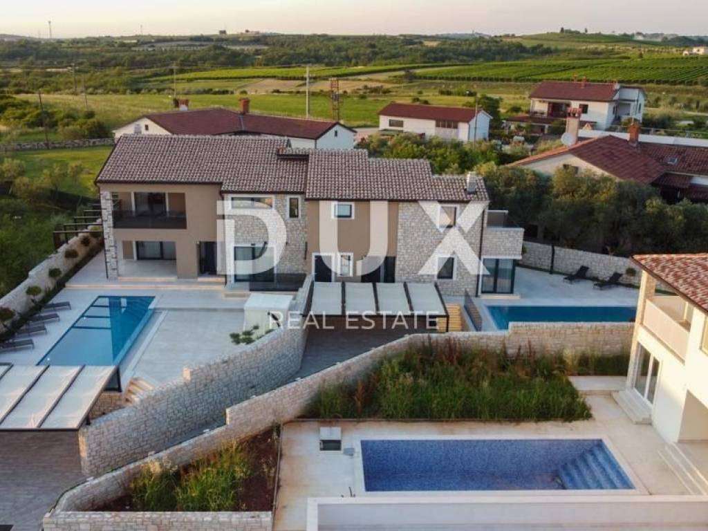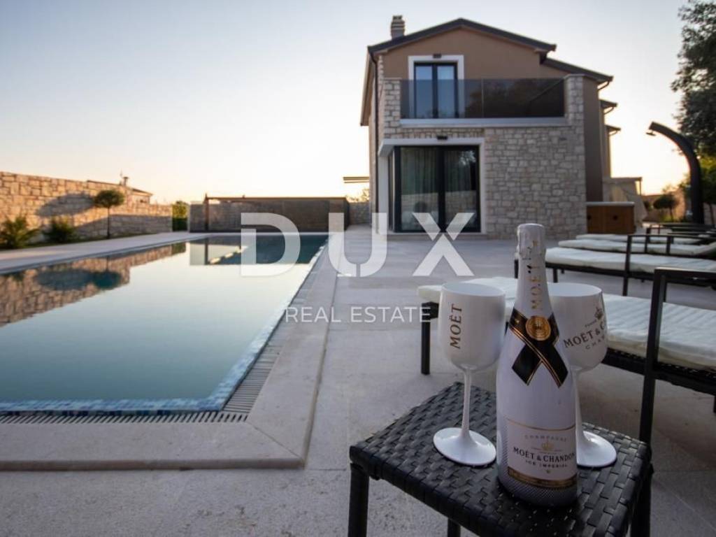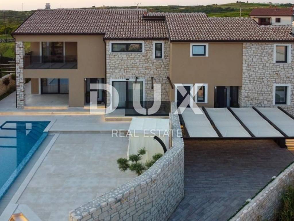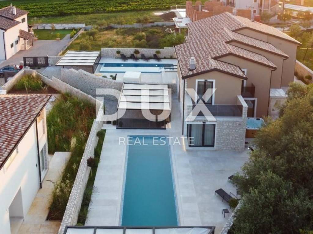 Brtonigla is a municipality rich in natural resources and proud of its untouched nature. It includes the sea coast and the inland, green, Istria. A mild, Mediterranean climate prevails in the territory of the municipality, which enables a pleasant stay throughout the year. Most of the active population of the municipality is engaged in agriculture, and the primary products of high quality are wine, olives and olive oil, cheese, fish, truffles, meat, Istrian prosciutto, vegetables, unique fragrant and aromatic herbs. Another basic economic branch in the municipality is tourism. There is also the second best aquapark in Europe. Located on a plot of approx. 400 m2, this spacious villa offers a total living area of 146.42 m2. The ground floor of the villa enchants you as soon as you step inside - it extends through an entrance hall, a guest toilet, two storage rooms (one inside and the other with access from the outside), a comfortable bedroom with a private bathroom and a terrace with a jacuzzi, and a spacious living room with a dining room and a high-quality modern kitchen in an open space concept. From the living room, there is a direct exit to the terrace and sunbathing area with a swimming pool, creating an idyllic corner for relaxation and enjoyment. We climb the stairs to the first floor of the villa, which includes a hallway and three elegantly decorated bedrooms, each with its own luxurious bathroom. Two bedrooms have access to spacious balconies. The furniture in the rooms is of high quality, and the air conditioners ensure comfort. Heating and cooling are provided by five quality air conditioners, while radiators are installed in the bathrooms. There is an option to install a fireplace as an additional source of heat. Italian designer ceramics are spread throughout the house, while the staircase is lined with wood. Anthracite-colored PVC carpentry contributes to the elegant look of the space, and custom-made furniture takes care of every detail. Video surveillance and an alarm system ensure the safety of the facility. The house has never been used and will not be rented out, which is an added advantage. In the exterior, the lighting in the garden, the stone fence, the infinity pool with a mosaic surface, the system of electrolysis of salt water and preparation for heating the pool, and the jacuzzi for complete relaxation are enchanting. Additional amenities include a landscaped garden, preparation for a summer kitchen, an electric portun and two parking spaces. Perfectly located near shops, restaurants, schools and kindergartens, this house offers quick access to nearby beaches, allowing the owners to enjoy all the benefits of Mediterranean life. This villa represents an excellent opportunity for family life, a luxurious vacation from the stress of city life in the Mediterranean climate or as a financial investment for rental. Dear clients, the agency commission is charged in accordance with the General Business Conditions www.dux-nekretnine.hr/opci-uvjeti-poslovanja