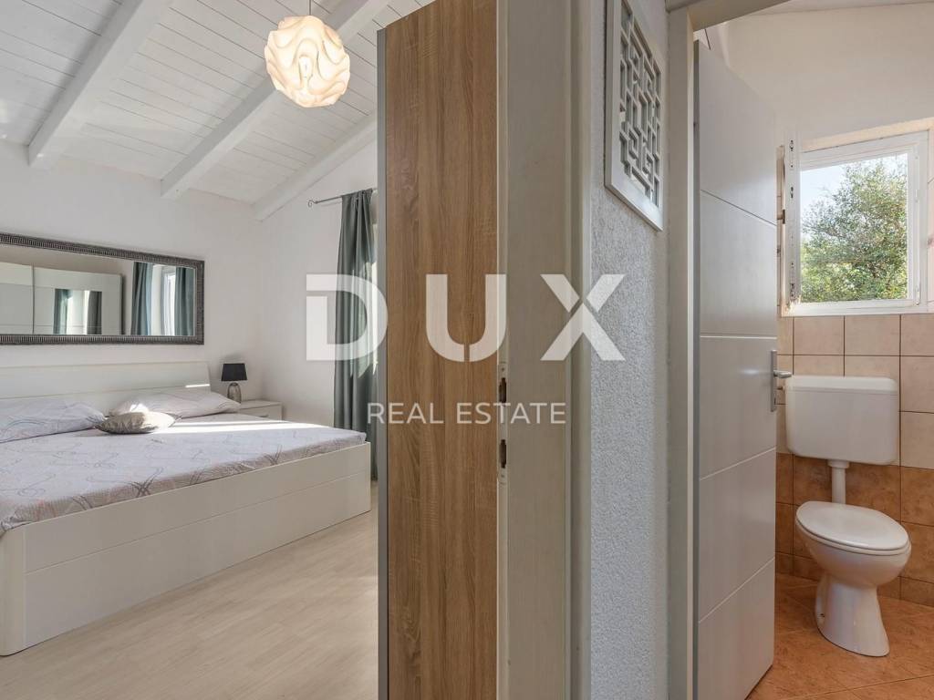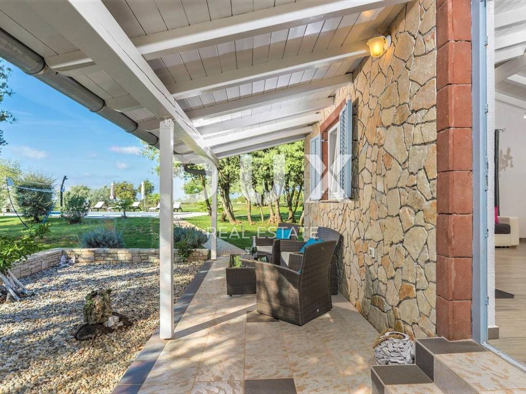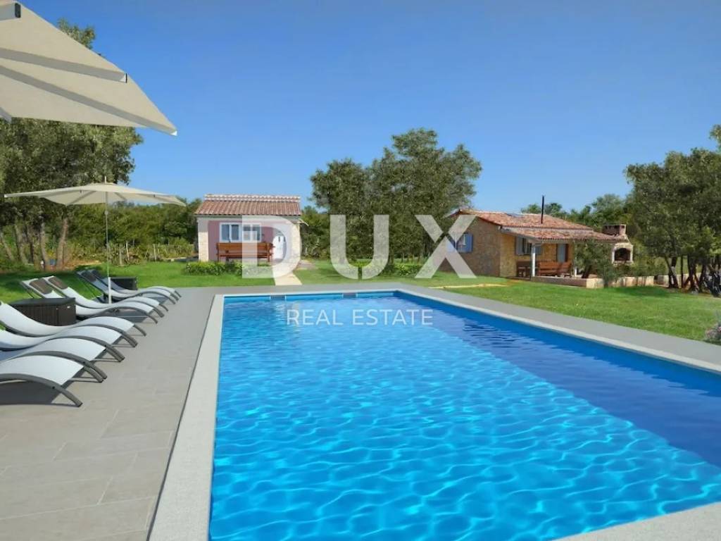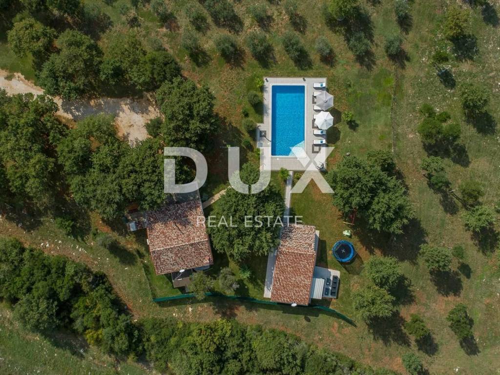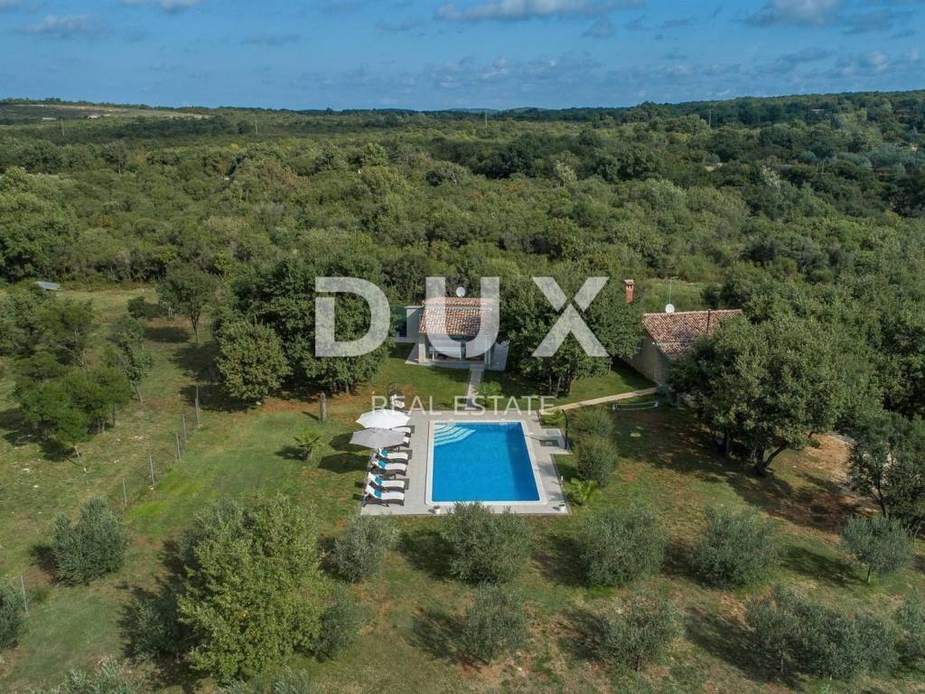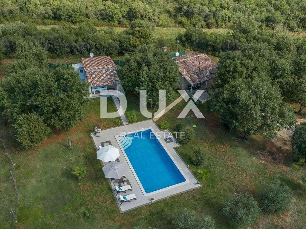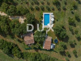 Not far from the town of Rovinj, in the autochthonous Mediterranean climate not far from the rocky coast with small sandy coves, for sale is a spacious idyllic property. This fairy tale surrounded by olive trees, stone, earth and untouched nature spreads over 21163 m2. Without disturbing the natural environment on the property there are two houses with a total living area of 117m2. Both ground floor houses consist of a living room with kitchen and dining area in an open concept, a bedroom, a bathroom and a covered terrace. The houses are airy and comfortable enough to create a fantastic oasis of a completely different world from the one we are used to. Uninterrupted peace is provided in the pool of 58 m2 with a sun deck and the only sounds that 'break' the silence are the chirping of birds and the swaying of branches in the wind. Due to its isolated and quiet location, hidden from view, this is an ideal opportunity for a quiet family life, rest and relaxation or as an investment for rent for tourist purposes.