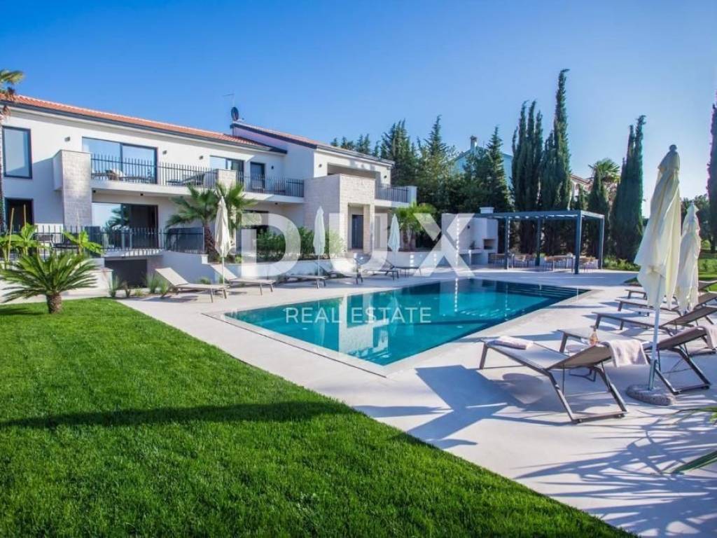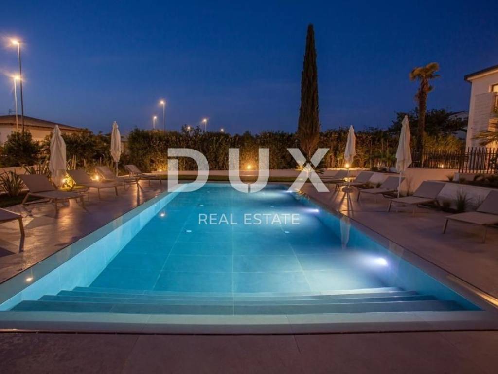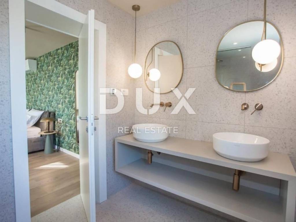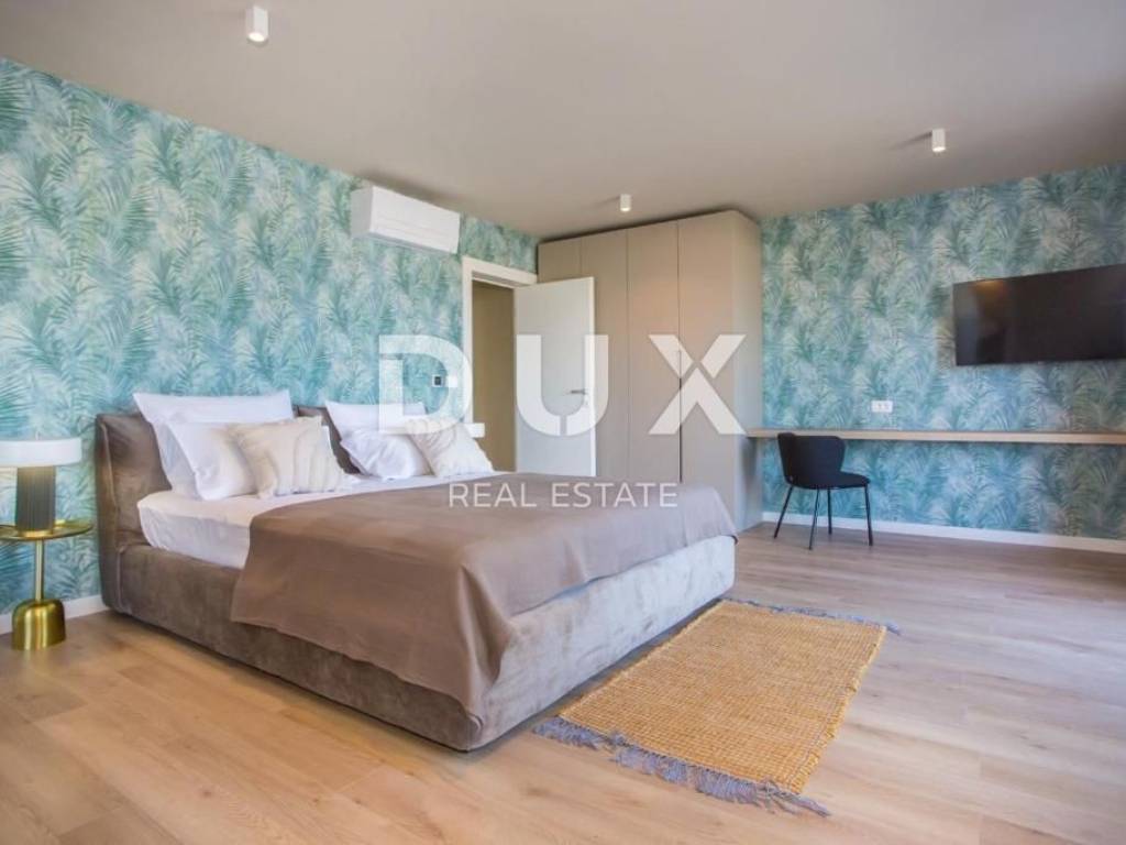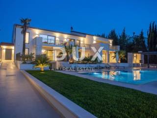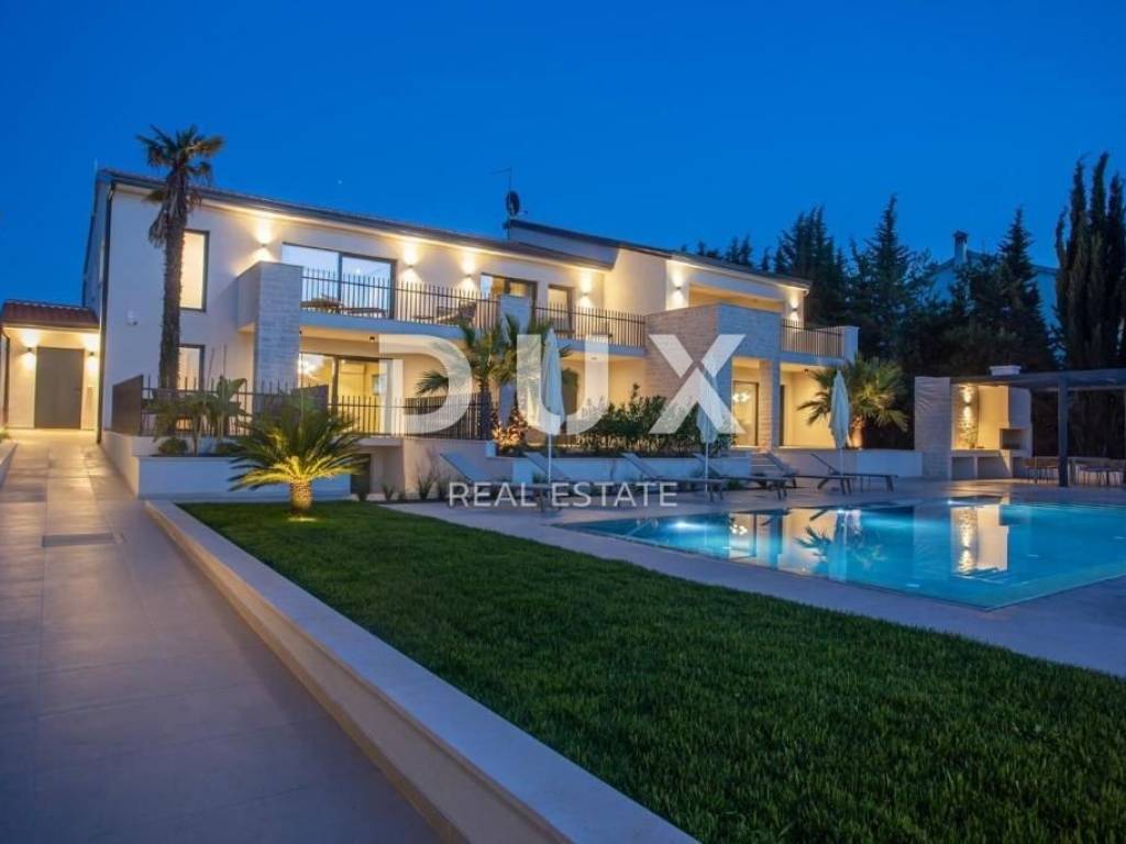It was founded by the Romans, conquered by the Venetians, and today it represents a chest of historical treasures and cultural heritage covered with modern 5-star luxury. The beauty of the city is hidden by a large number of tourists who enjoy the hospitality and top service of this Istrian pearl every year. For sale is a luxurious villa, located in Poreč, 1 kilometer from the sea and the first beaches. This beautiful property covers 683 m2 of living space divided into three residential units. Each apartment is designed with attention to detail. On the ground floor of each unit there is a bright living room decorated with large glass walls and windows, a thoughtfully designed kitchen with an elegant modern aesthetic, a comfortable sleeping area with a wardrobe, a well-equipped bathroom, an additional storage room, and another decorated bathroom. The second floor of each apartment has two beautiful bedrooms, each with its own private bathroom and a terrace with a beautiful view of the sea. This villa is equipped with video surveillance, and furnished with luxurious Italian furniture and exquisite decorations. The bathrooms are decorated with luxurious Catalano and Grohe sanitary ware, which is an example of commitment to the highest quality standards. For optimal comfort in winter days, the villa is equipped with a heat pump, underfloor heating and individual air conditioners in each room. It is sold fully furnished and equipped, which allows the new owner to move in immediately and live in luxury. The outdoor landscape is a green oasis of a total of 1753 m2, with an array of lush greenery, including large palms and cypresses. This idyllic property is completed by an additional storage space of 33 m2, a heated swimming pool of 40 m2, parking for 8 cars and a spacious summer kitchen of 35 m2. This villa harmoniously blends the beauty of its natural surroundings with the best of modern living, making it a haven for those seeking the ultimate in luxury living. It has potential for summer rental, which makes it an attractive investment opportunity. This is an ideal opportunity for those who want to have their own home or invest.