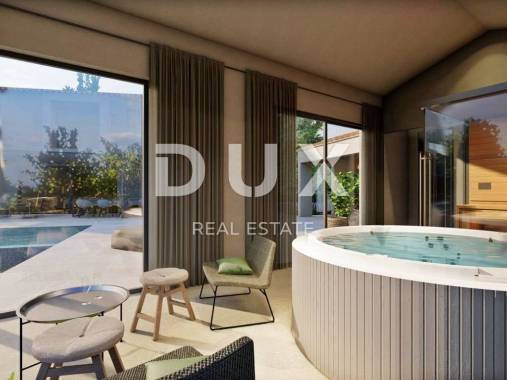 The eternally lush greenery of Mediterranean plants, lawns and olive trees, where peace, quiet and harmony with nature can be felt in every corner, is landscaped and fenced, and the central part is occupied by a heated overflow pool of 72 m with a sunbathing area.