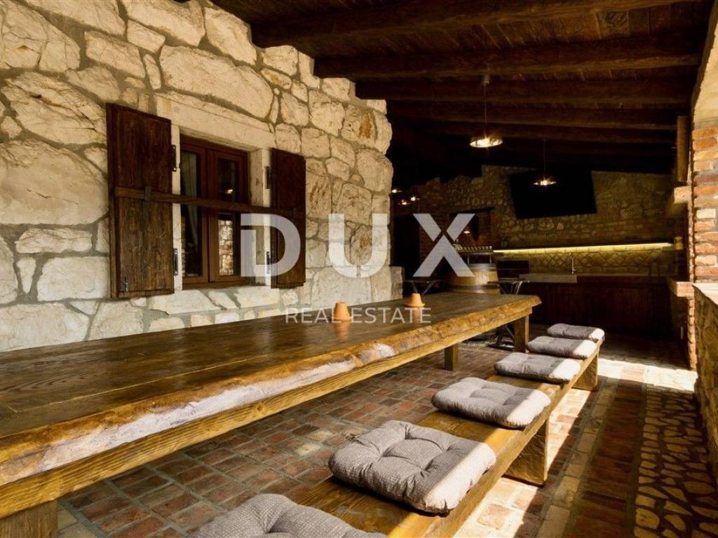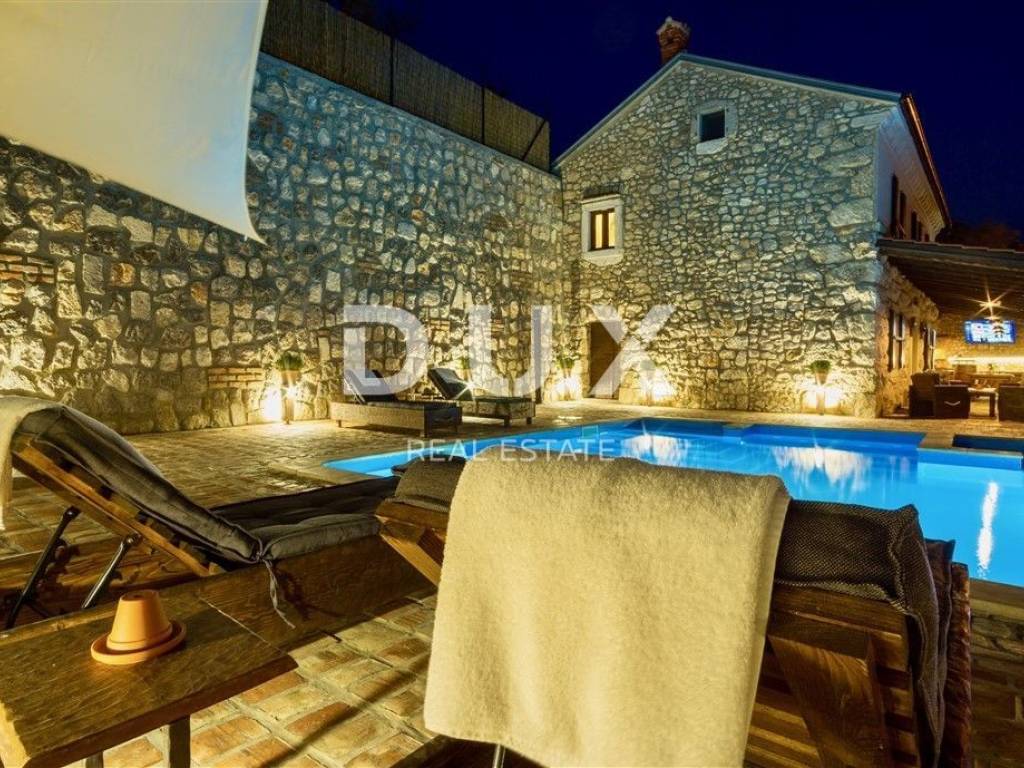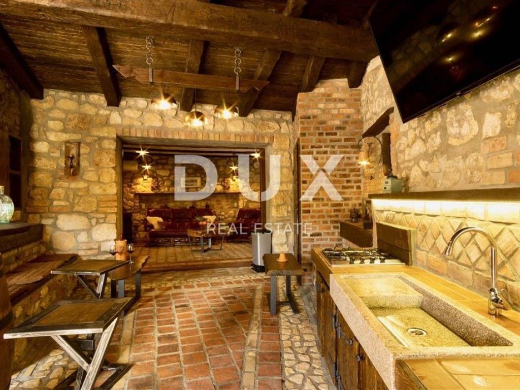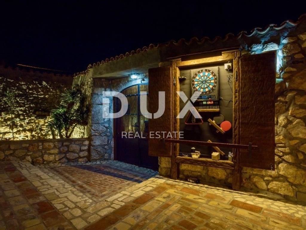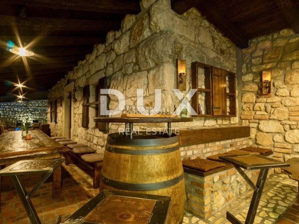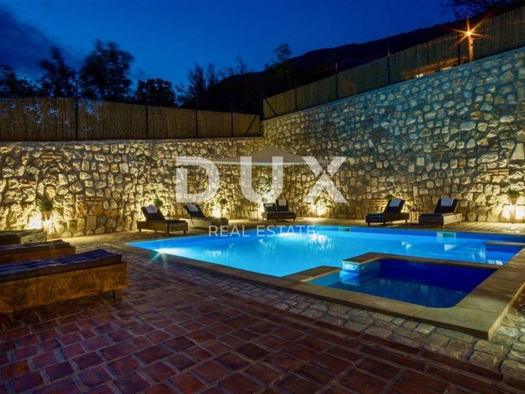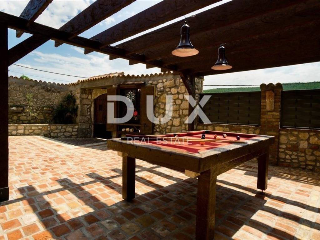 This beautifully decorated villa is located on a hill above Crikvenica in a very quiet location. The house is decorated in antique style in the Mediterranean style and is built of stone. It has been completely renovated and completed this year. It consists of ground and first floor. The ground floor is designed so that there is one bedroom with private bathroom, separate toilet, living room, large dining room and kitchen. Upstairs there are four bedrooms, each with its own bathroom with toilet. Rooms are decorated so that each has air conditioning for heating and cooling and television. The garden consists of a covered terrace in front of the house where there is a large table for socializing and barbecue. A large swimming pool has been set up, a canopy under which a billiard table has been set up and designed as a space for socializing. Stone walls have been erected on the side of the road to allow complete privacy for the owner. In front of the entrance there is a fenced parking lot for four cars. This stone house is a great investment with a well-established business or it is possible to enjoy peace and quiet.