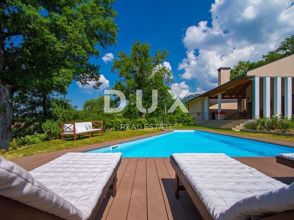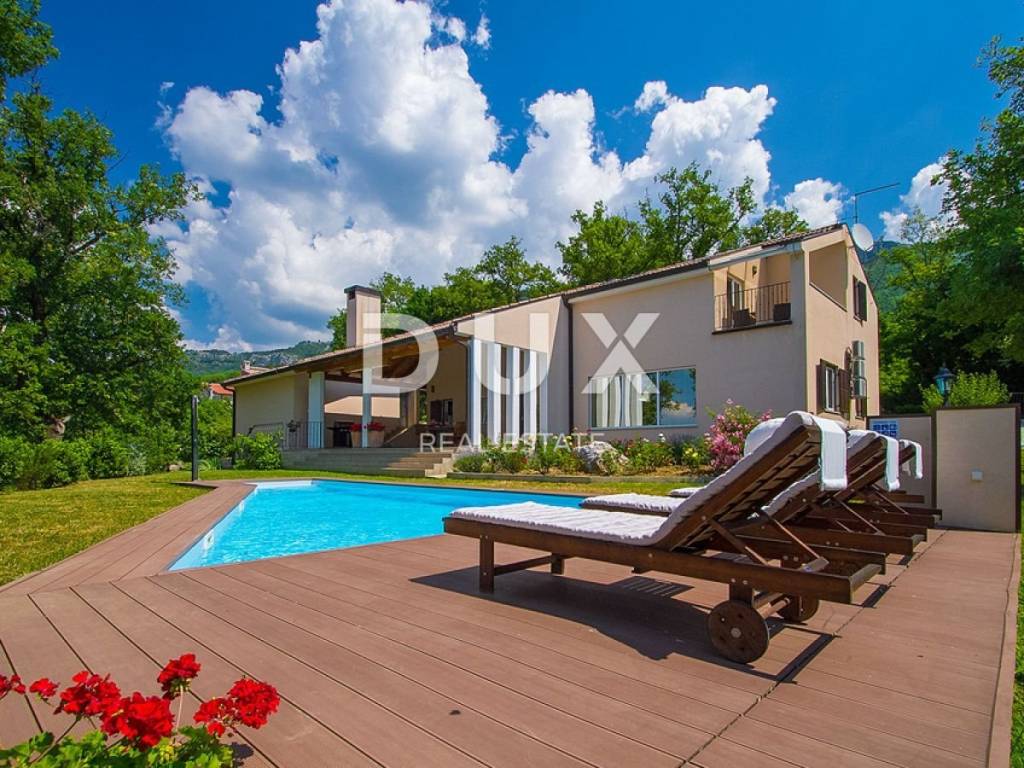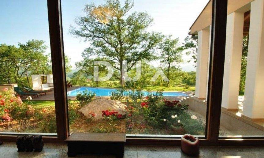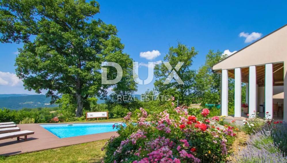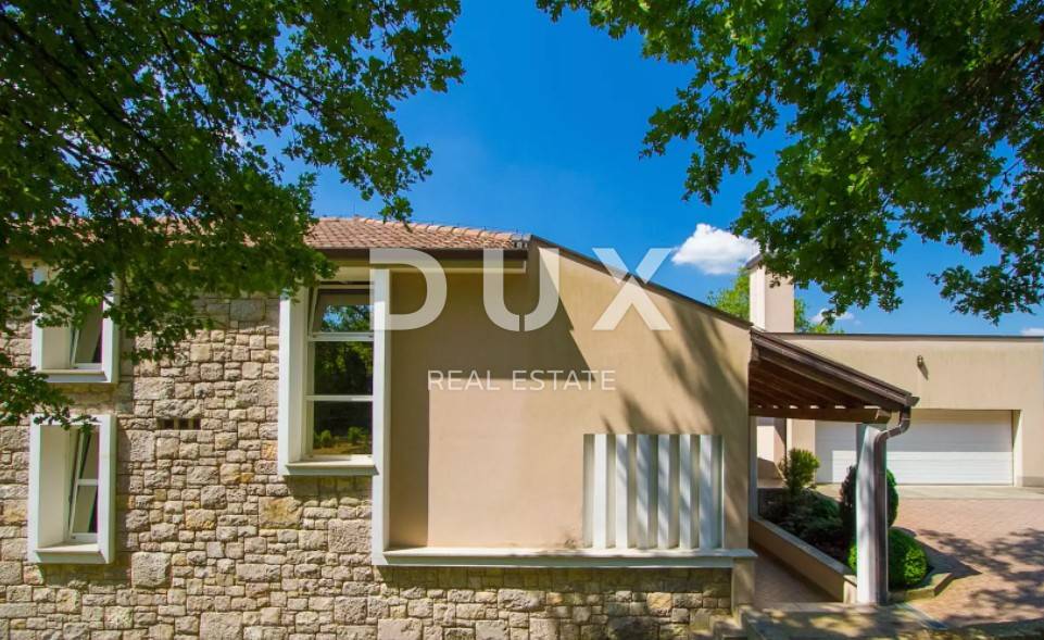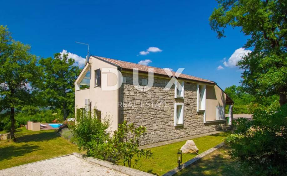 Near the town of Buzet, a modernly designed villa with a swimming pool in a spacious garden is for sale. This superbly equipped and decorated, award-winning villa of 285 m2 extends through the ground floor and first floor while next to the villa there is a garage of 36 m2 with a basement. In the basement there is a boiler room and a spacious typical Istrian tavern with an open fireplace for pleasant gatherings on rainy and colder days. The ground floor of the villa has a fully equipped kitchen with dining area and living room with access to a covered terrace of 50m2, bedroom with private bathroom equipped with whirlpool tub, pantry and toilet. On the first floor of the villa there are three bedrooms, study, pantry, two bathrooms and a covered terrace. Spacious rooms, quality furniture, exceptional equipment and central heating guarantee the exceptional comfort of this well-built villa. Spacious property of 3030 m2 on which the villa and pool of 50 m2 with sun deck are located, immaculately decorated and maintained and provides a lot of peace and privacy. The perfect property for a quiet family life close to all the amenities needed for living or investing with a lot of tourist potential given the many specifics of Buzet, areas of rich excursion opportunities throughout the year and beautiful views from the hillsides. OPPORTUNITY!!!