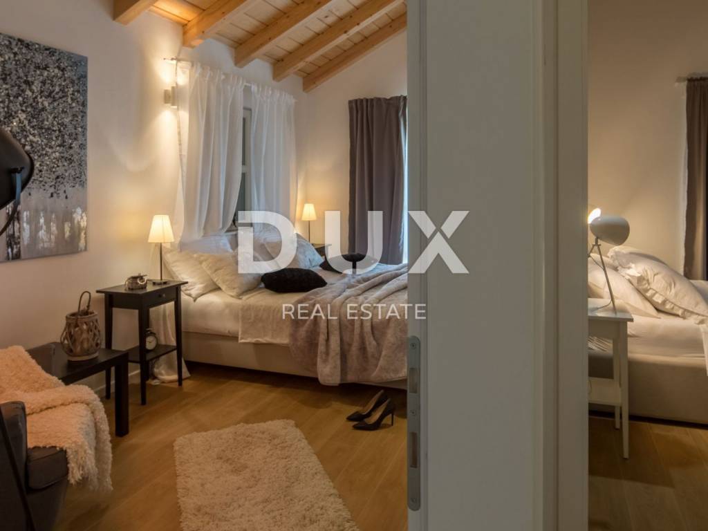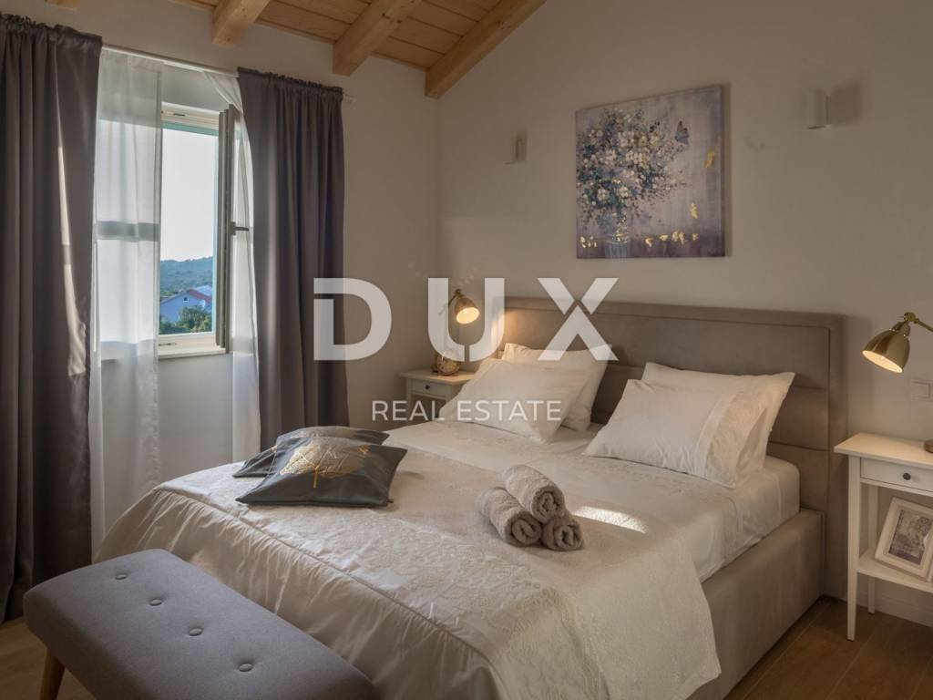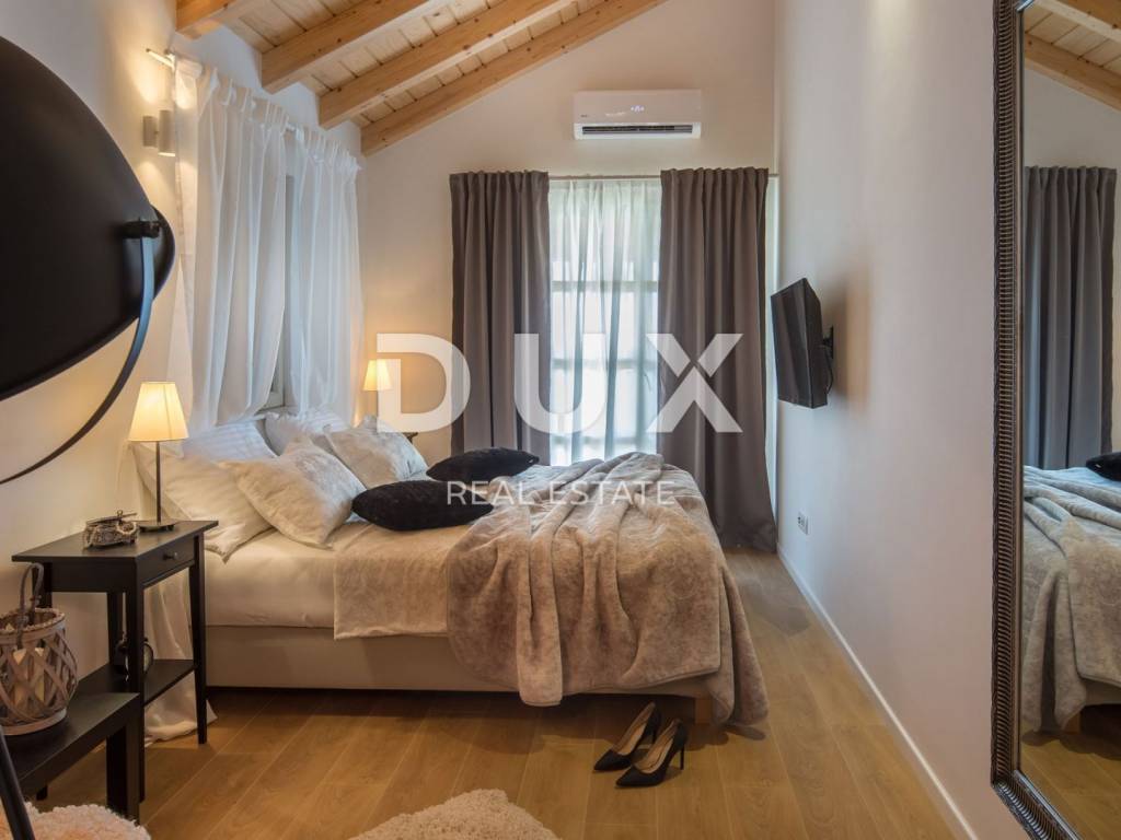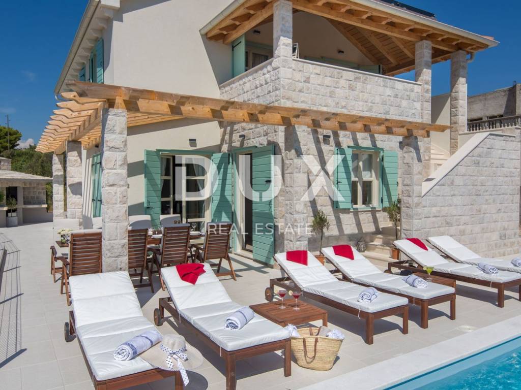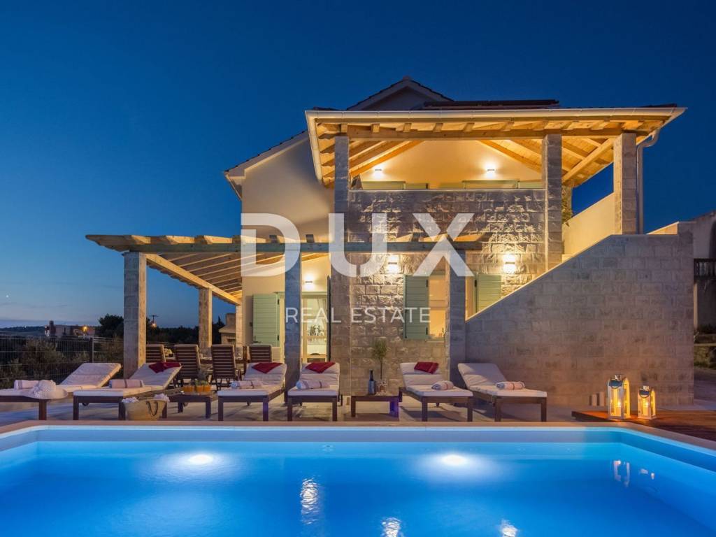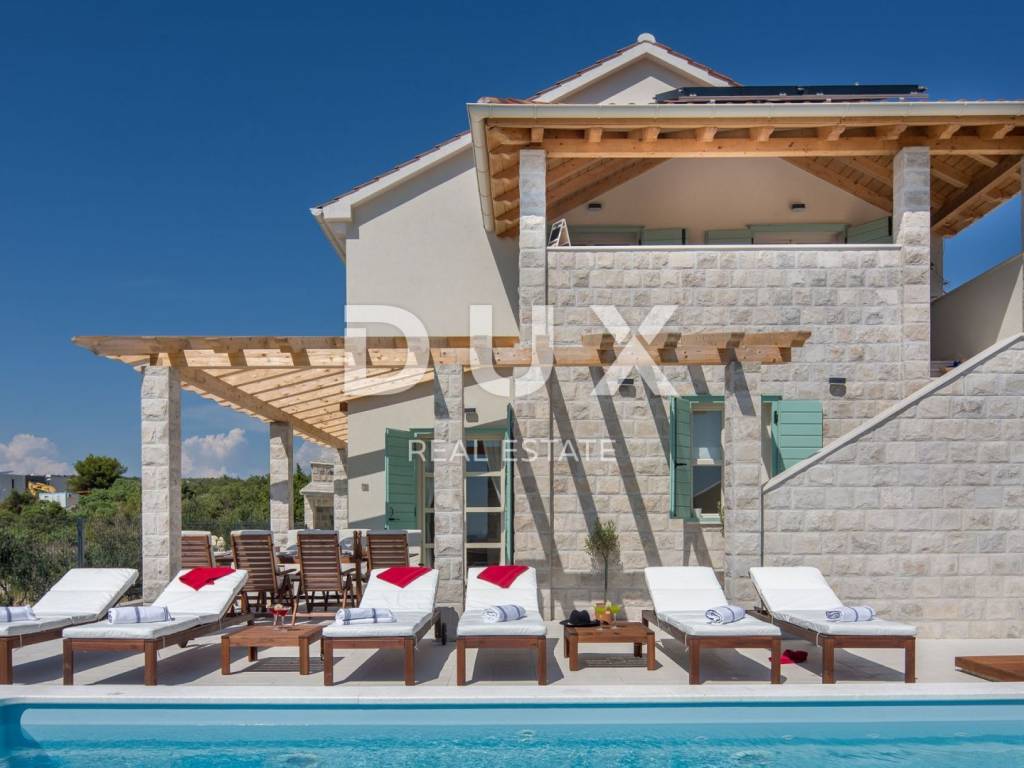 In a quiet environment just 1.2 kilometers from the sea and the first beaches and 1.5 kilometers from the center of Primosten, a beautiful villa with a swimming pool and an enchanting panoramic view of the sea, olive groves and nature is for sale. This beautiful villa is located in an idyllic place that provides everything you need to relax and escape from city life. On the landscaped garden there is a beautiful fireplace and an outdoor terrace in front of which is a swimming pool with idyllic views of the pearls of the Adriatic. The villa has a total area of 185 m2 and is divided into two floors. The ground floor consists of a hallway, pantry, bathroom, one bedroom, kitchen, dining room and living room with direct access to the terrace and pool. From the ground floor there is a beautiful view of the surrounding landscapes, olive groves, the sea and long sunsets. On the first floor of the house there are three bedrooms and each room has a private bathroom, and one bedroom has its own wardrobe. Two bedrooms have access to a spacious covered terrace with a fabulous view. The villa is equipped with solar panels for hot water, and the bedrooms are made with wooden ceilings with beams that give a special warmth to the interior. The special feature of this house are its high ceilings which give extra space to this villa. Heating and cooling is via air conditioning. The villa is for sale furnished. This villa is a great opportunity for family life, a luxury vacation from the stress of city life in a Mediterranean climate or as a financial investment for rent.